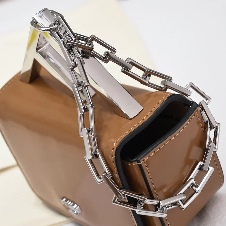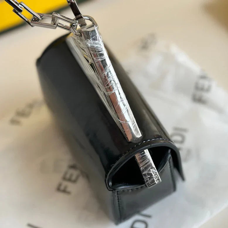 In smooth cowhide leather with flap, oversized FF shaped handles and magnetic snap closure. Detachable chain with clip fastening for attaching to larger handbags or on the wrist, or as an evening bag!