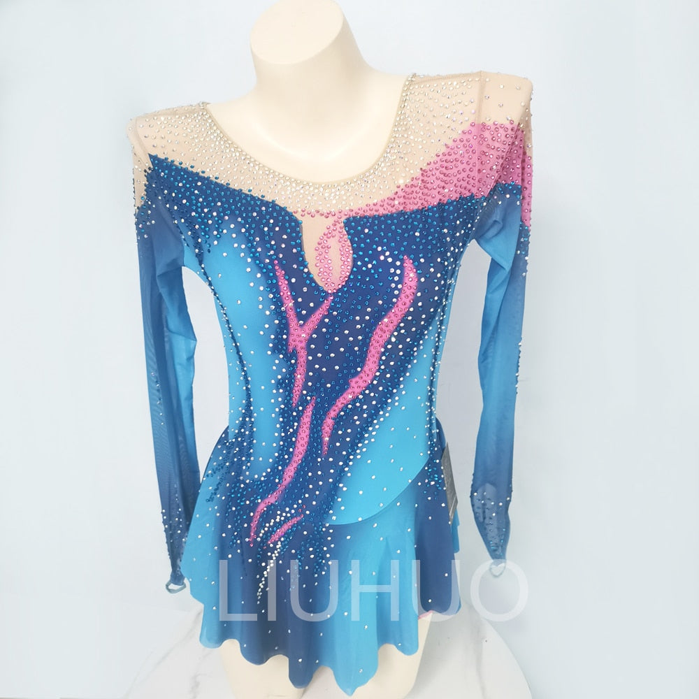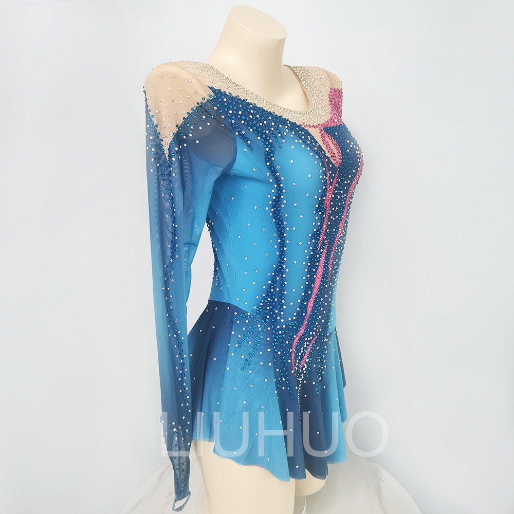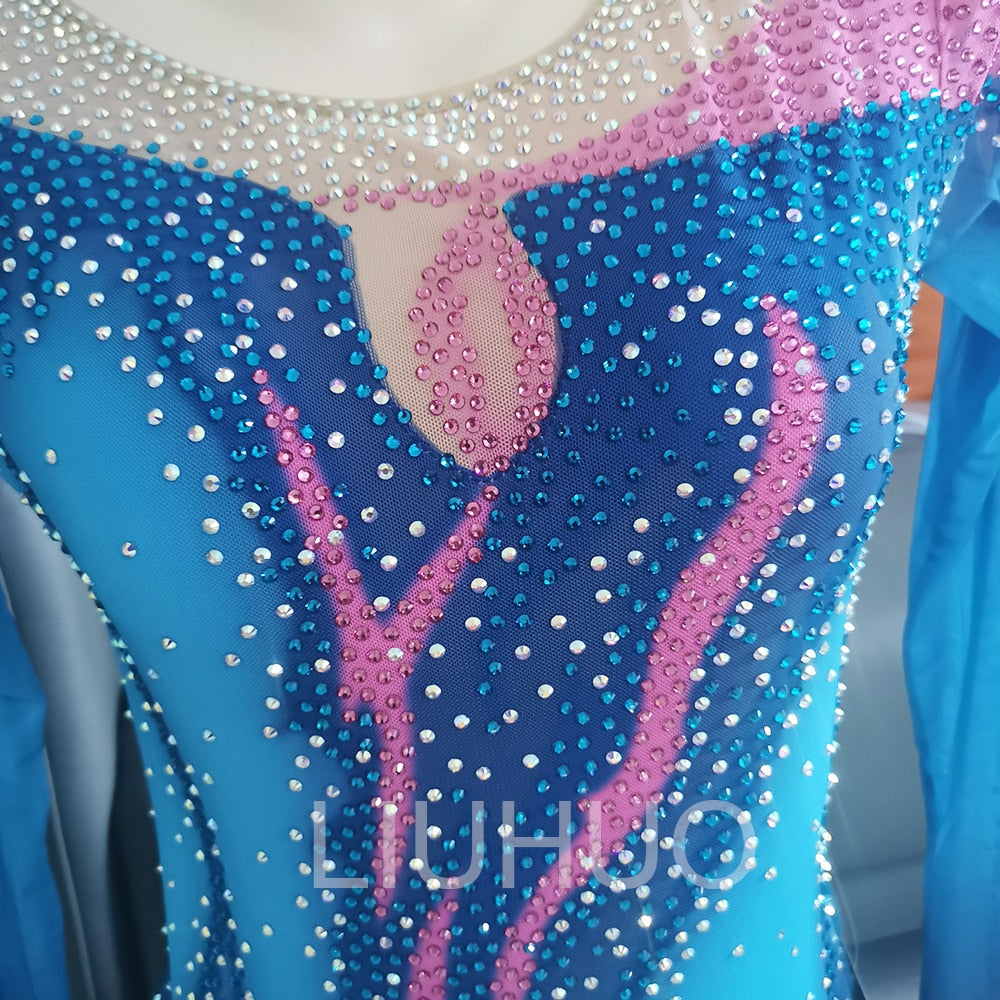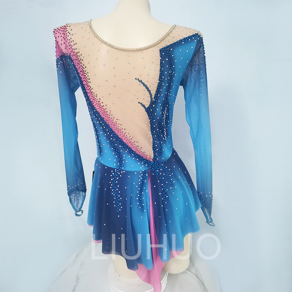 ❤ Features:This LIUHUO figure - skating dress is a striking piece. It combines a vivid blue base color with a gradient effect, complemented by bold pink accents that create a dynamic visual impact. The sheer neckline and long sleeves are embellished with numerous sparkling rhinestones, adding a touch of glamour. The unique cut - out detail at the chest enhances its stylishness. The flowing skirt allows for unrestricted movement, making it an excellent choice for skaters to showcase their skills with flair on the ice.