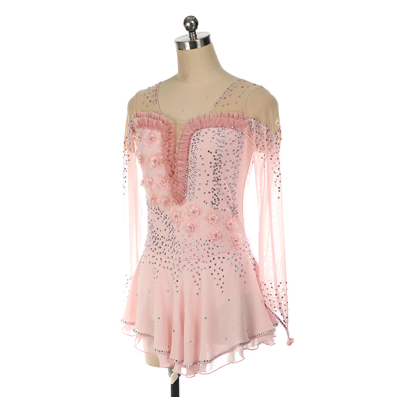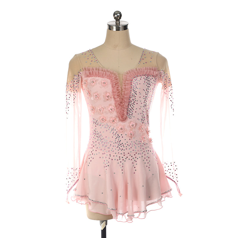 ❤ Features:This LIUHUO figure skating dress in soft pink features sheer, flowing sleeves dotted with rhinestones. The bodice has a ruffled, V - shaped neckline, 3D floral accents, and is densely adorned with sparkling crystals. The flared skirt with delicate ruffles adds a graceful touch, ideal for skaters to showcase elegance on ice.