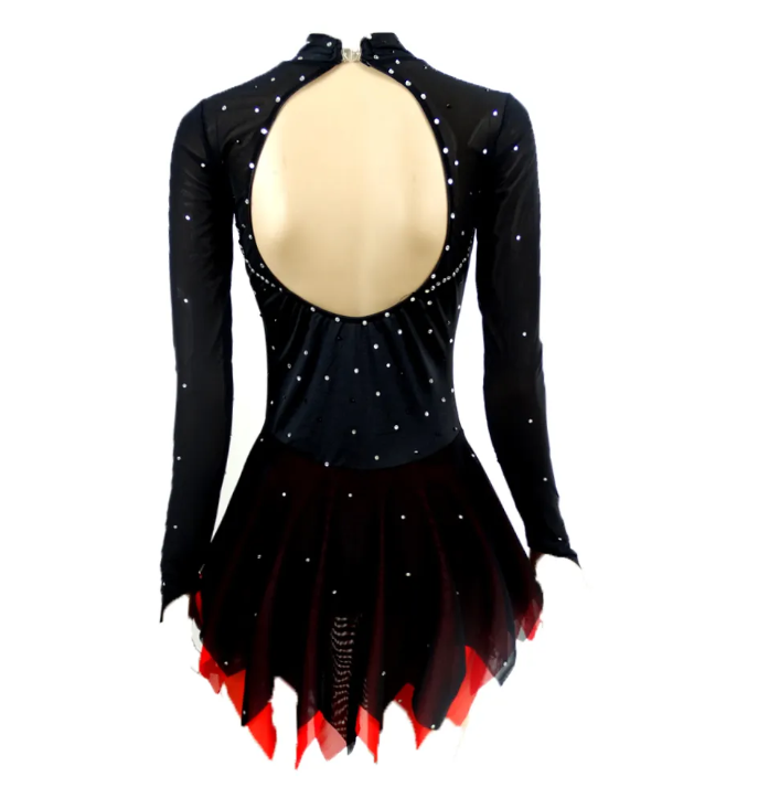 ❤ Features: This figure - skating dress is uniquely charming. Dominated by black, it creates a mysterious and profound atmosphere. The high - neck design with a distinctive cut - out shape features smooth lines, adding a touch of sexiness and fashion. The dress is embellished with numerous shiny rhinestones, twinkling like stars and dazzling under the lights. The long - sleeve design fits the arm lines, echoing the overall style. The skirt has a black - to - red gradient, with the red part in a jagged shape, adding vitality and dynamism to the overall look, enabling the wearer to fully showcase confidence and elegance on the ice.