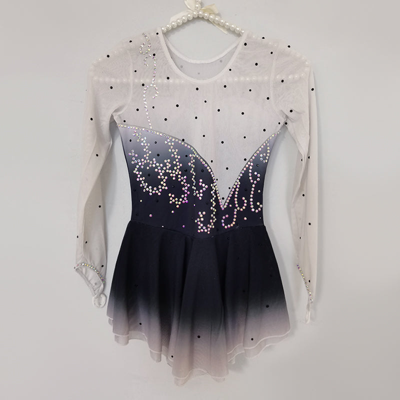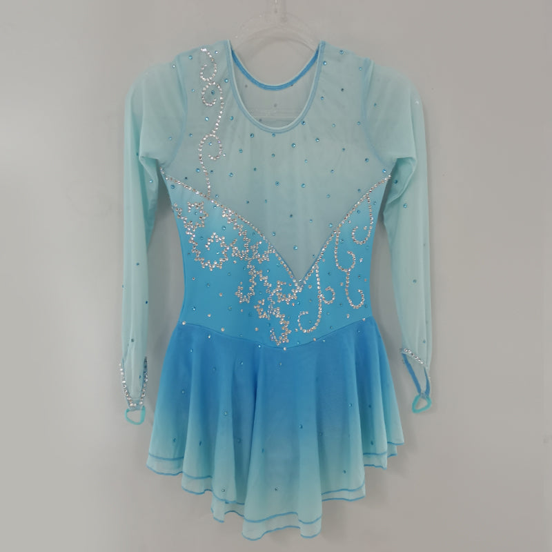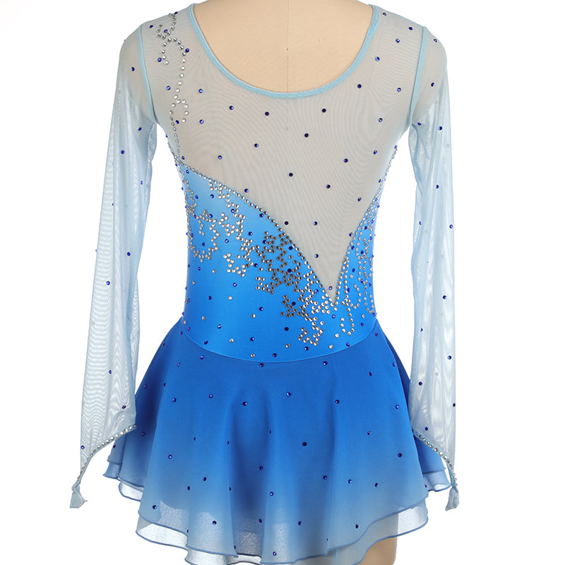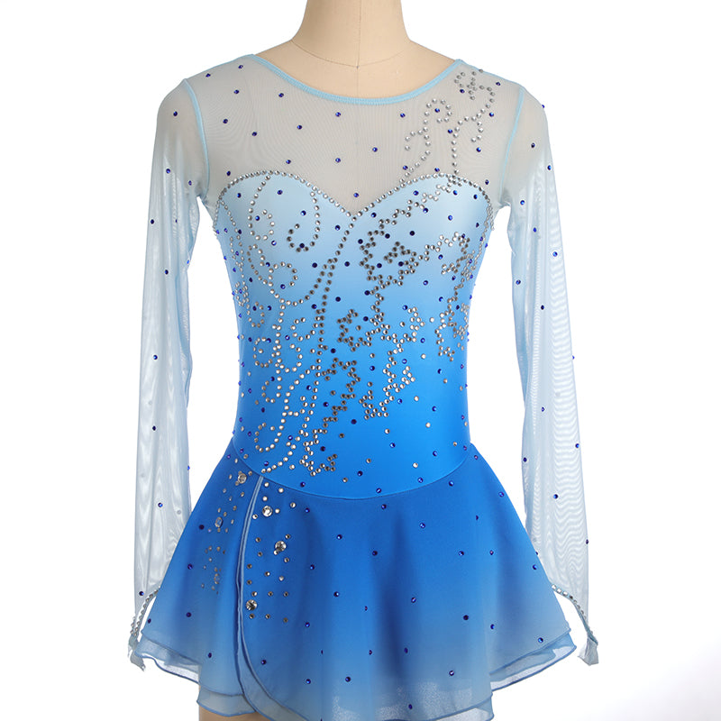 ❤ Features:This LIUHUO figure skating dress has a light blue gradient color, sheer long sleeves, and is decorated with sparkling rhinestone patterns on the bodice. The skirt is flared, creating an elegant look suitable for ice - skating performances.