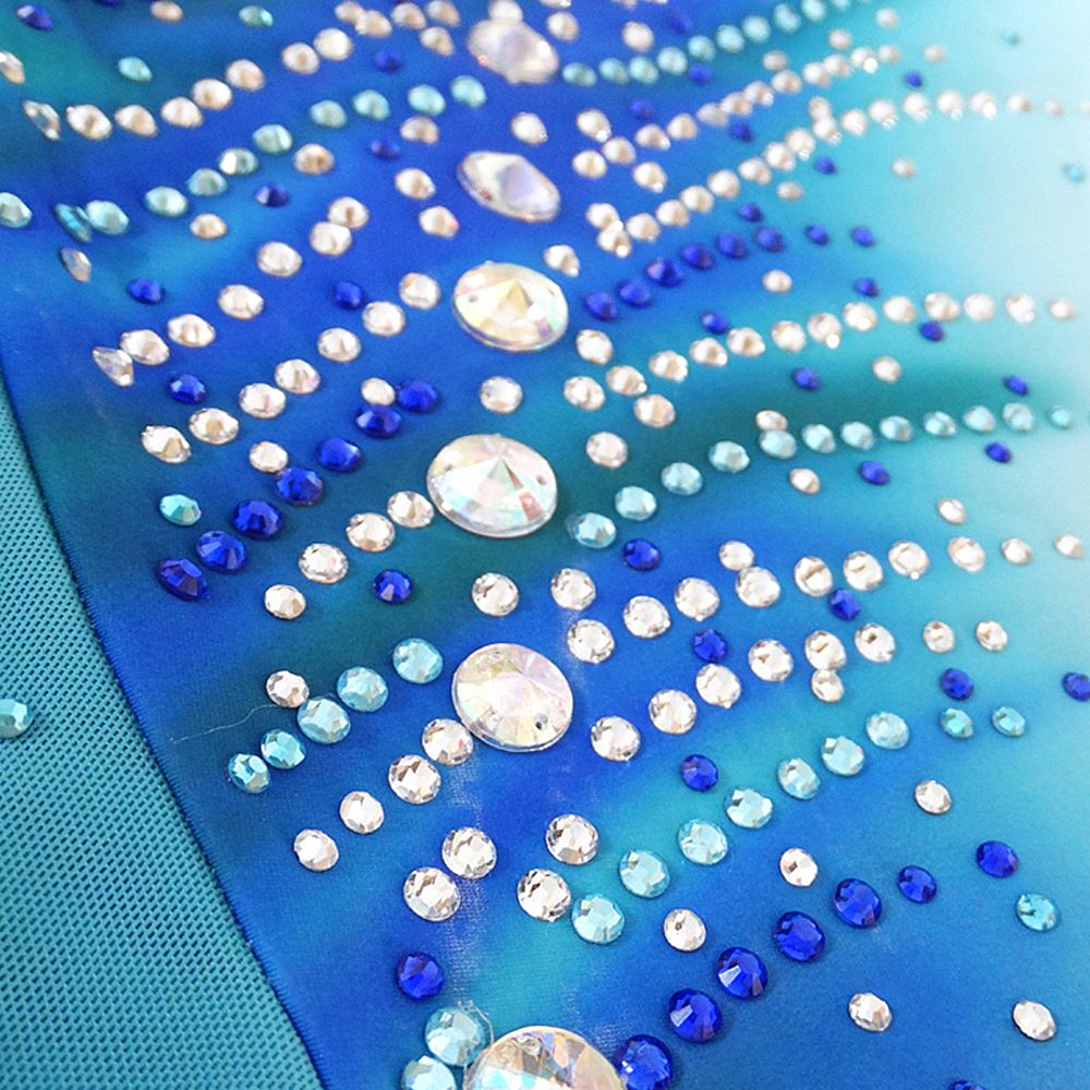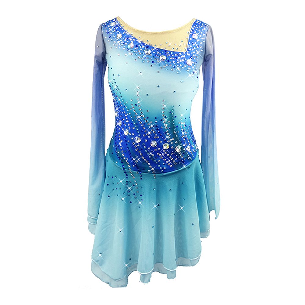 ❤ Features:This LIUHUO figure skating dress features a gradient color from light blue to dark blue. It has long sheer sleeves and a round neckline. The dress is lavishly decorated with sparkling rhinestones, creating a dazzling effect. The skirt part is flowy, made of light - weight fabric, which is perfect for graceful skating movements.