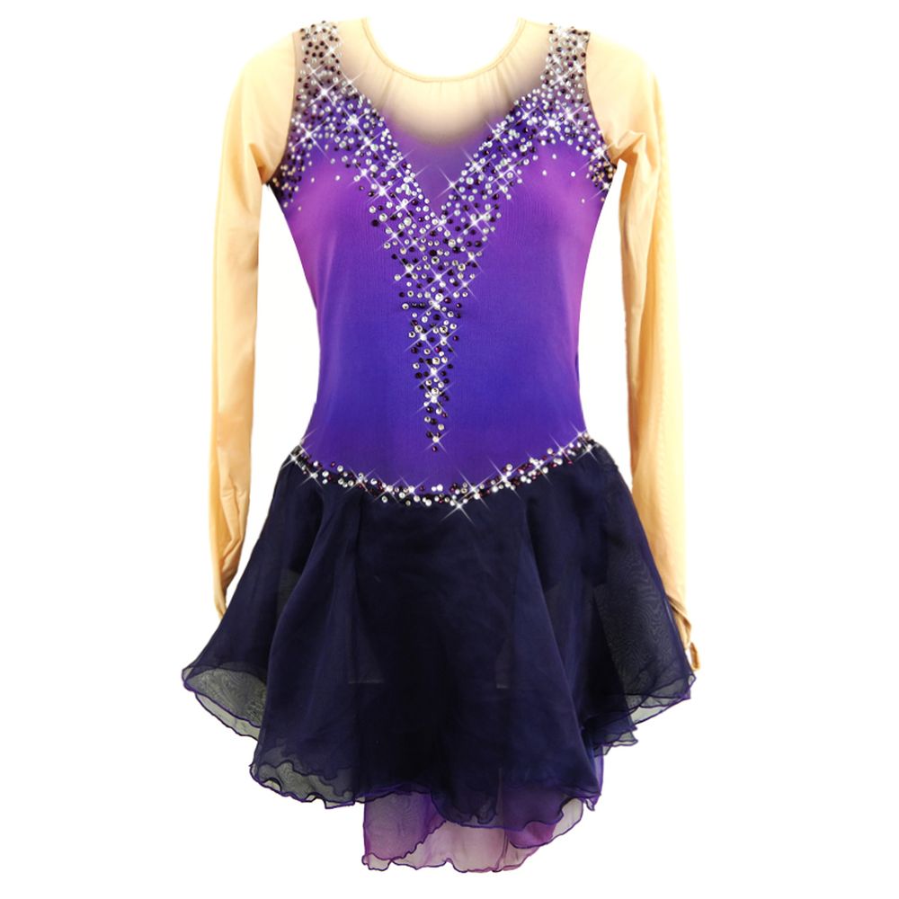 ❤ Features:This LIUHUO figure skating dress presents a purple - toned bodice paired with a dark skirt. It features sheer beige sleeves, and the bodice is lavishly decorated with sparkling crystals in a V - shaped pattern. Crafted from high - stretch fabric, it offers a flexible and comfortable fit. Customizable for women and girls, it combines elegance and performance for skating shows.