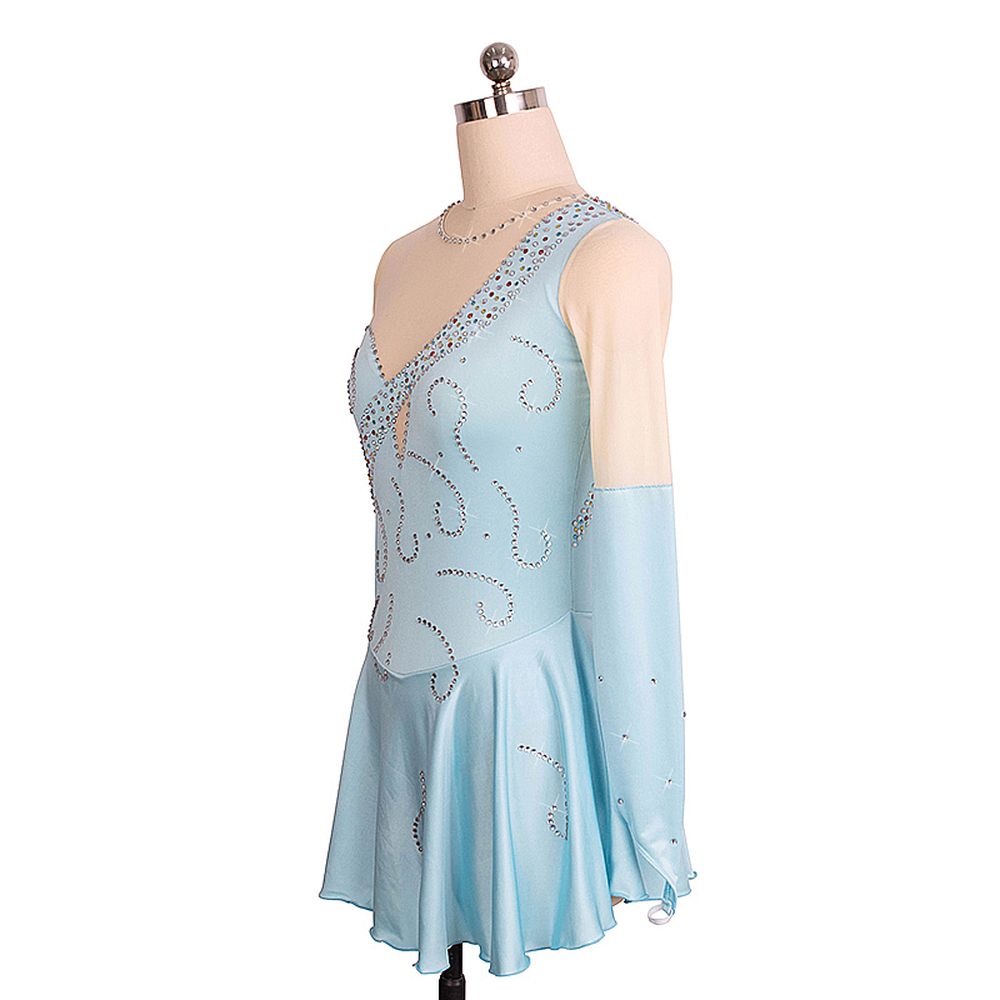 ❤ Features:This LIUHUO figure skating dress is light blue, featuring sheer beige sleeves, a unique one - shoulder - like design with colorful rhinestones along the strap, and silver - toned swirl patterns dotted with crystals. It has a flared skirt, ideal for elegant skating performances.