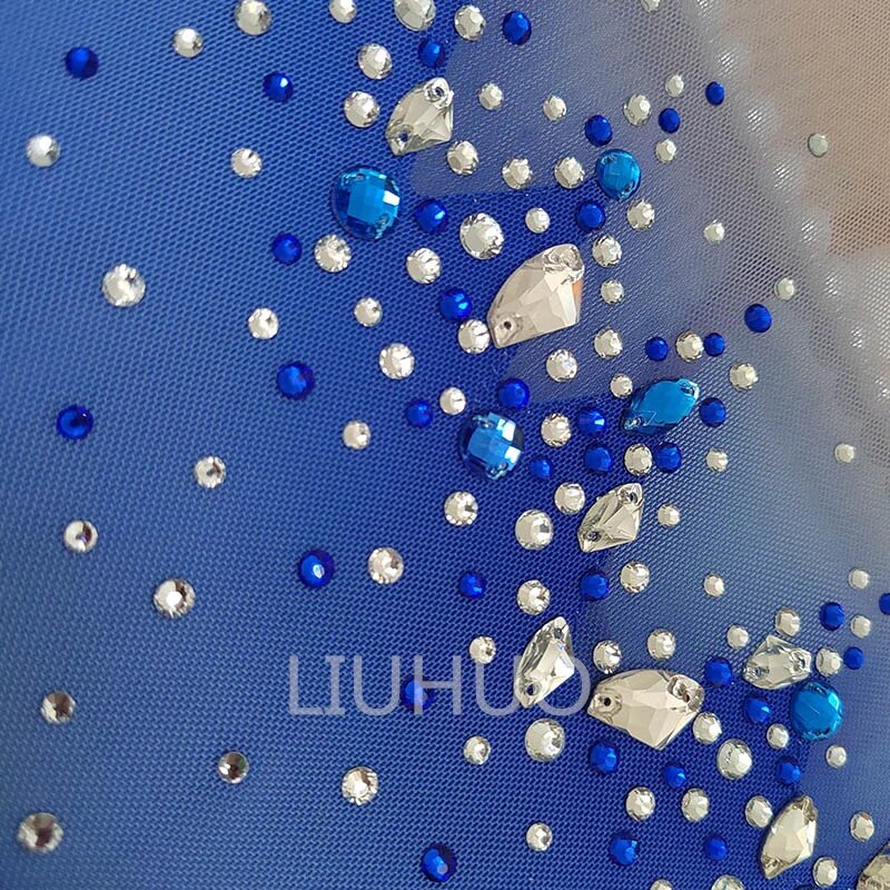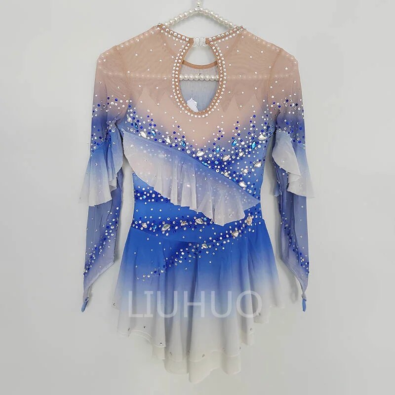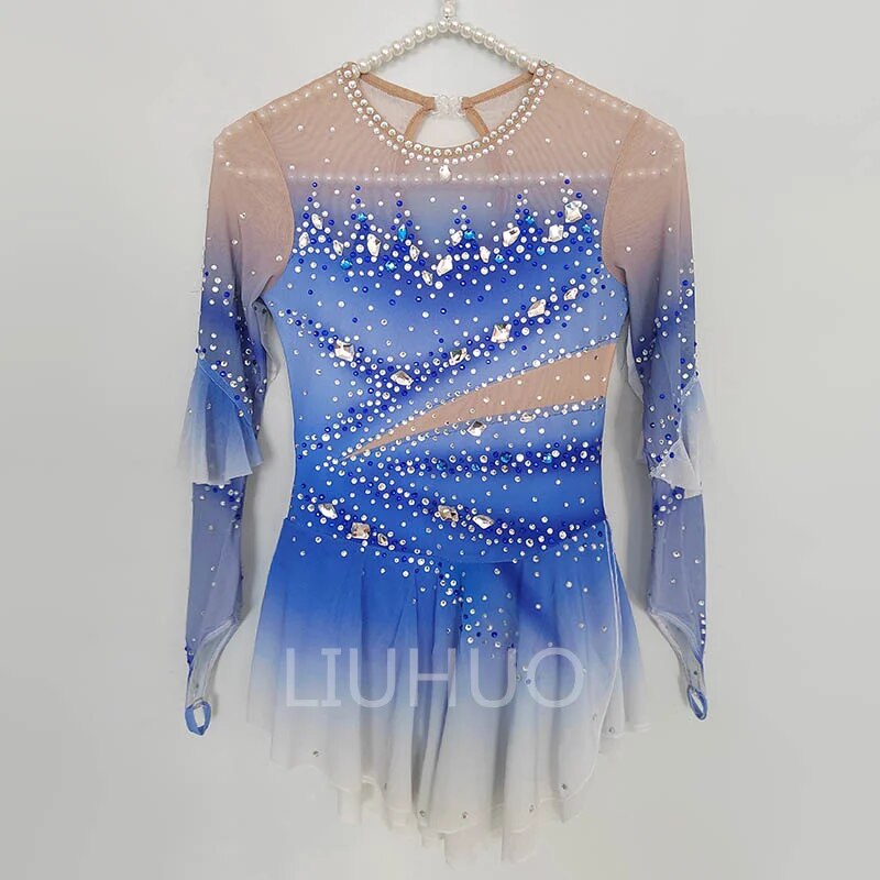 ❤ Features:This is a long - sleeved figure - skating dress. It showcases a gradient transitioning from light blue to white. The upper part features a sheer mesh neckline, elegantly bordered with a string of pearls. The entire dress is densely embellished with sparkling rhinestones, arranged in an artistic pattern that enhances its visual appeal. The sleeves have ruffled details, adding a touch of sophistication. The flared skirt is made of flowing fabric, making it suitable for figure - skating performances, perfectly combining style and functionality. It can serve as an eye - catching option for dance performances or competitions, similar to other specialized performance outfits designed to highlight the wearer's movements and stage presence.