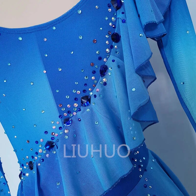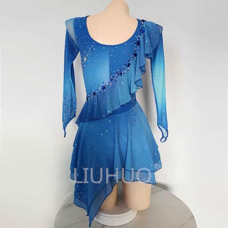 ❤ Features:This is a long - sleeved figure - skating dress. The main body features a blue gradient, transitioning smoothly from dark blue to light blue. The dress is adorned with sparkling rhinestones, arranged in diagonal lines, which adds a sense of luxury. The sleeves are made of a light and translucent fabric, harmoniously matching the main fabric. The skirt has a multi - layer design, which is light and flowing, facilitating skaters to perform various moves on the ice. This dress is suitable for both adults and children and can be used as a performance, competition, or grading - exam outfit, combining both aesthetic appeal and practicality.