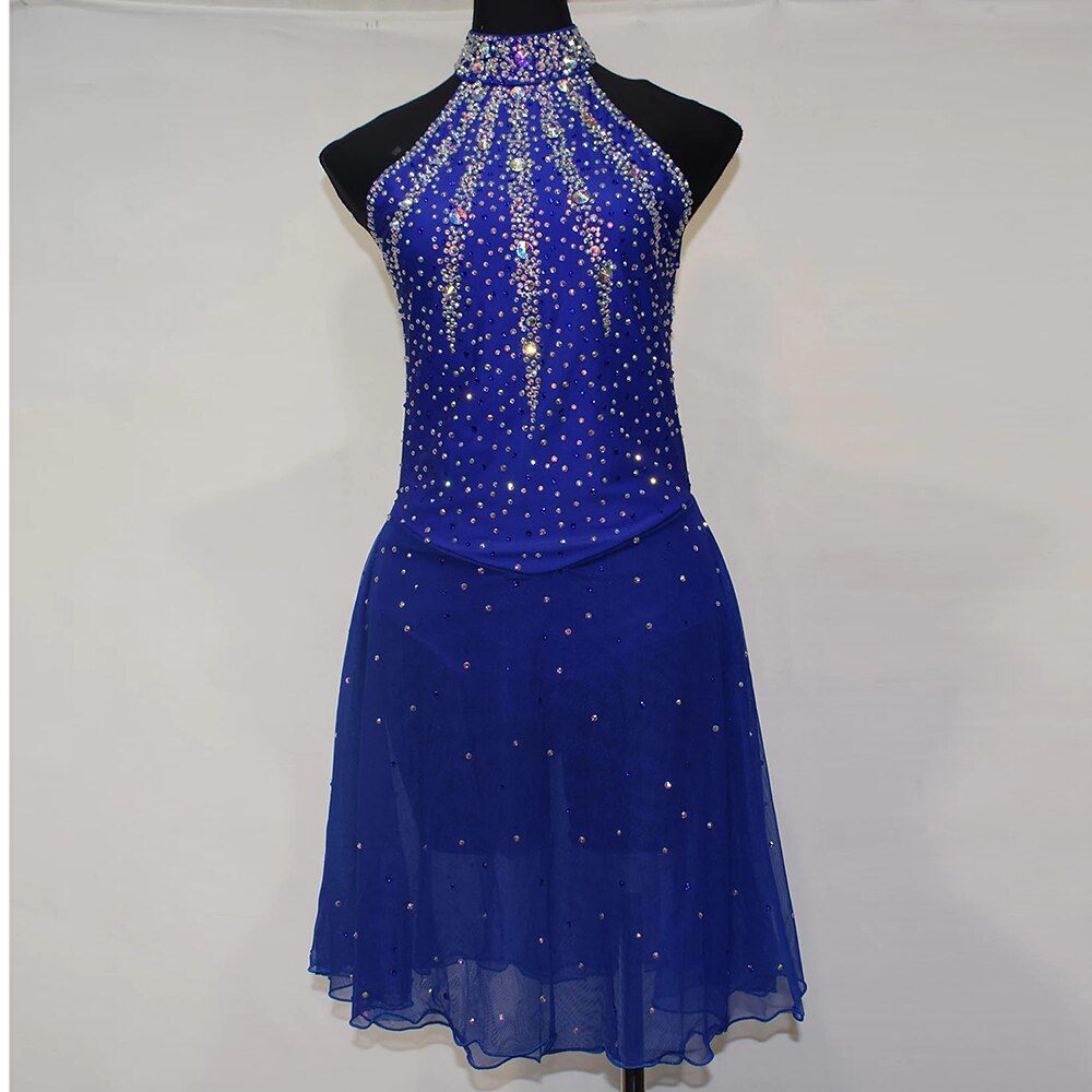 ❤ Features:This LIUHUO figure - skating dress is a stunning creation. It features a high - halter neckline that exudes elegance and grace. The dress is predominantly a rich blue color, adorned with an abundance of sparkling rhinestones meticulously arranged in vertical lines and scattered across the fabric. These embellishments catch the light, creating a dazzling effect. The skirt is made of flowing, sheer fabric that adds a sense of movement and fluidity, making it perfect for ice - skating performances. Overall, it combines style and sparkle for a captivating look on the ice.