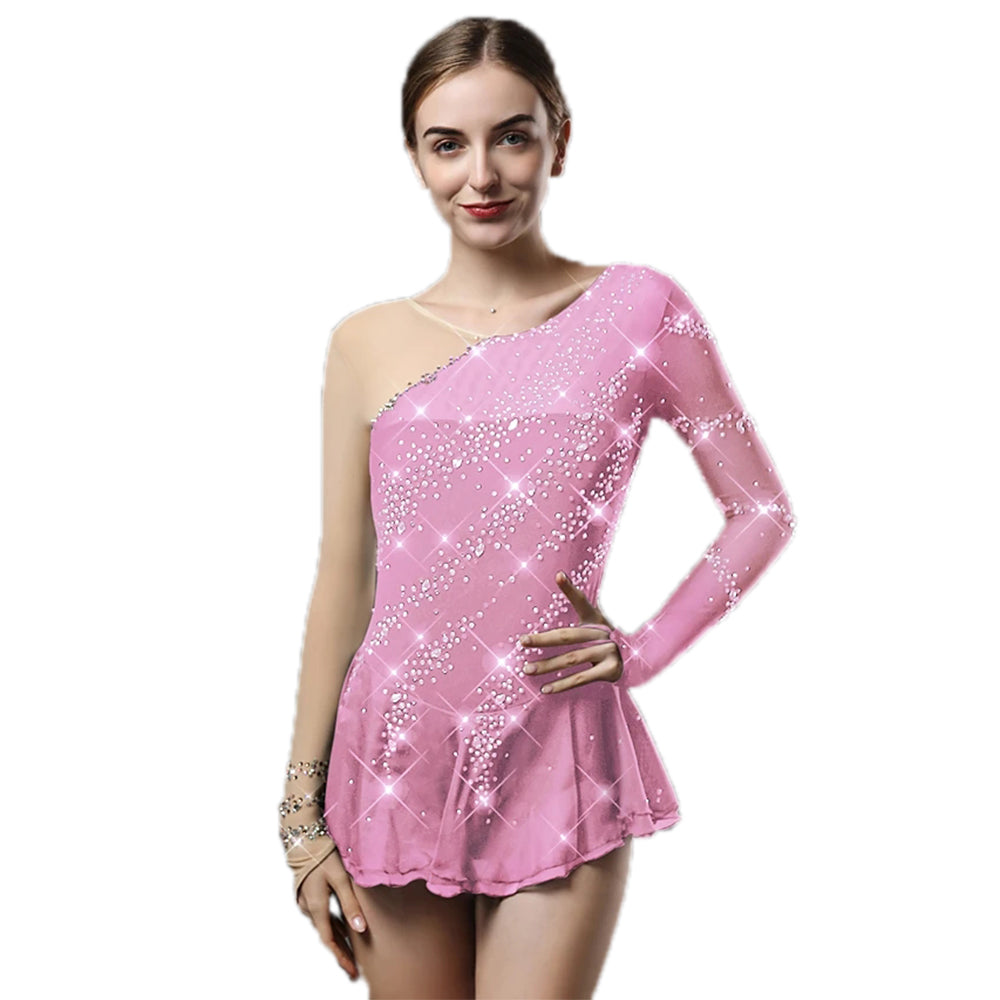 ❤ Features:This is a one - sleeved figure skating dress. The main body is black, with a transparent mesh panel on the side of the single sleeve. The whole dress is covered with shiny rhinestones, creating a dazzling visual effect. It is suitable for women or girls to wear during figure skating performances.