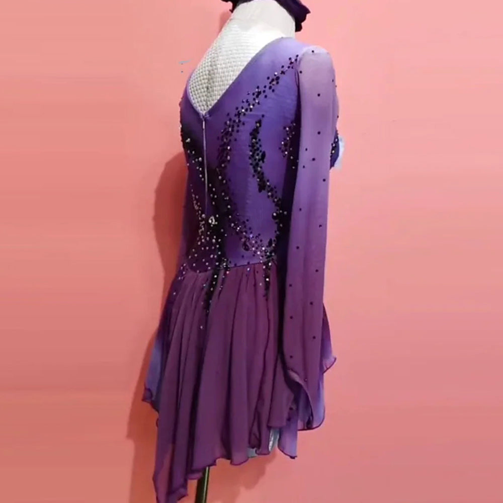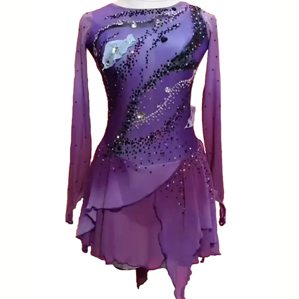 ❤ Features:This is LIUHUO's figure - skating dress. It has a purple gradient as the main color, long sleeves, and the dress is decorated with black, silver and other colors of rhinestones and flower decorations. The skirt is layered and irregular, gorgeous and exquisite, suitable for figure - skating performances.