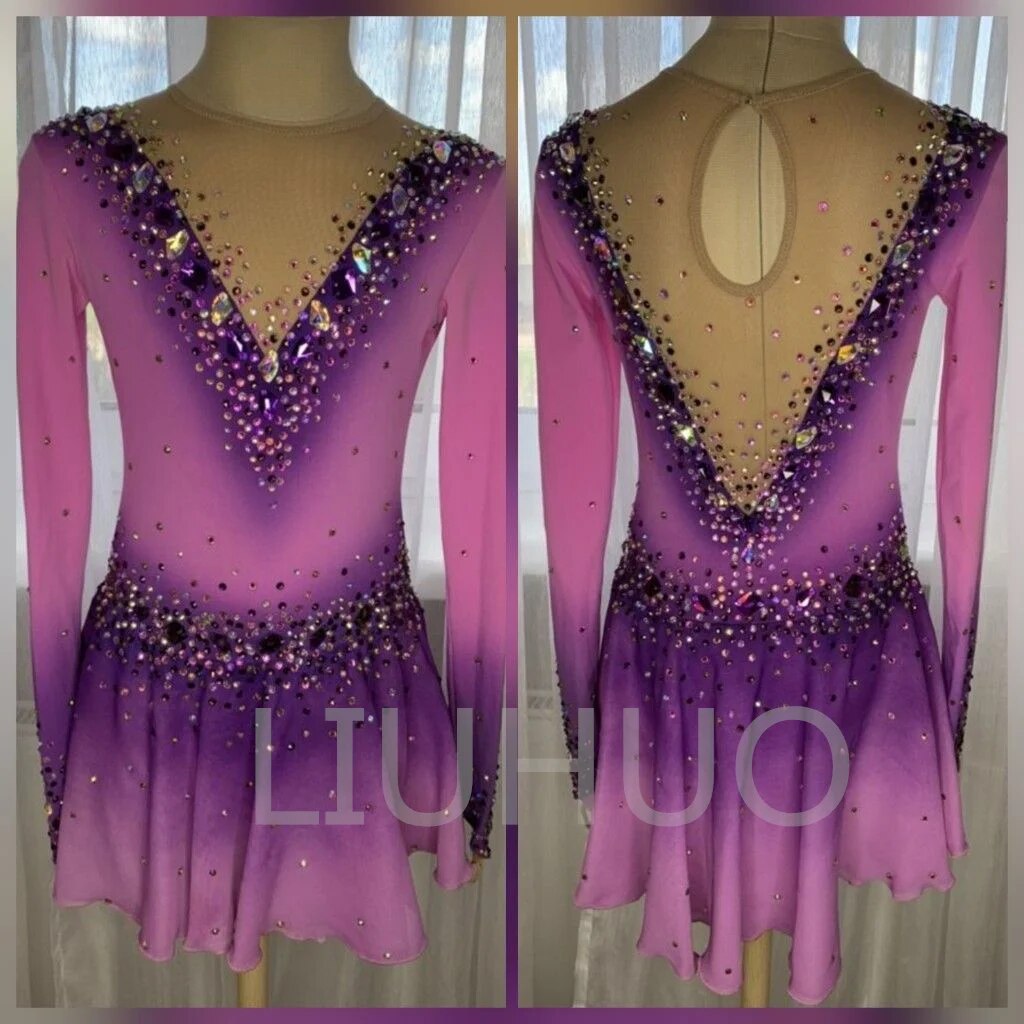 ❤ Features:This LIUHUO figure - skating dress is an exquisite creation that seamlessly marries style and sparkle. It flaunts a stunning gradient transitioning from pink to purple, imbuing it with a dreamy and ethereal quality. The long - sleeved, sheer fabric adds an element of elegance, while the bodice and skirt are densely studded with numerous rhinestones, creating a dazzling visual effect. The front features a V - neckline intricately embellished with stones, drawing the eye, and the back showcases a deep V - cut with a circular detail, also lavishly decorated. This dress is a perfect choice for skaters aiming to shine on the ice during performances.