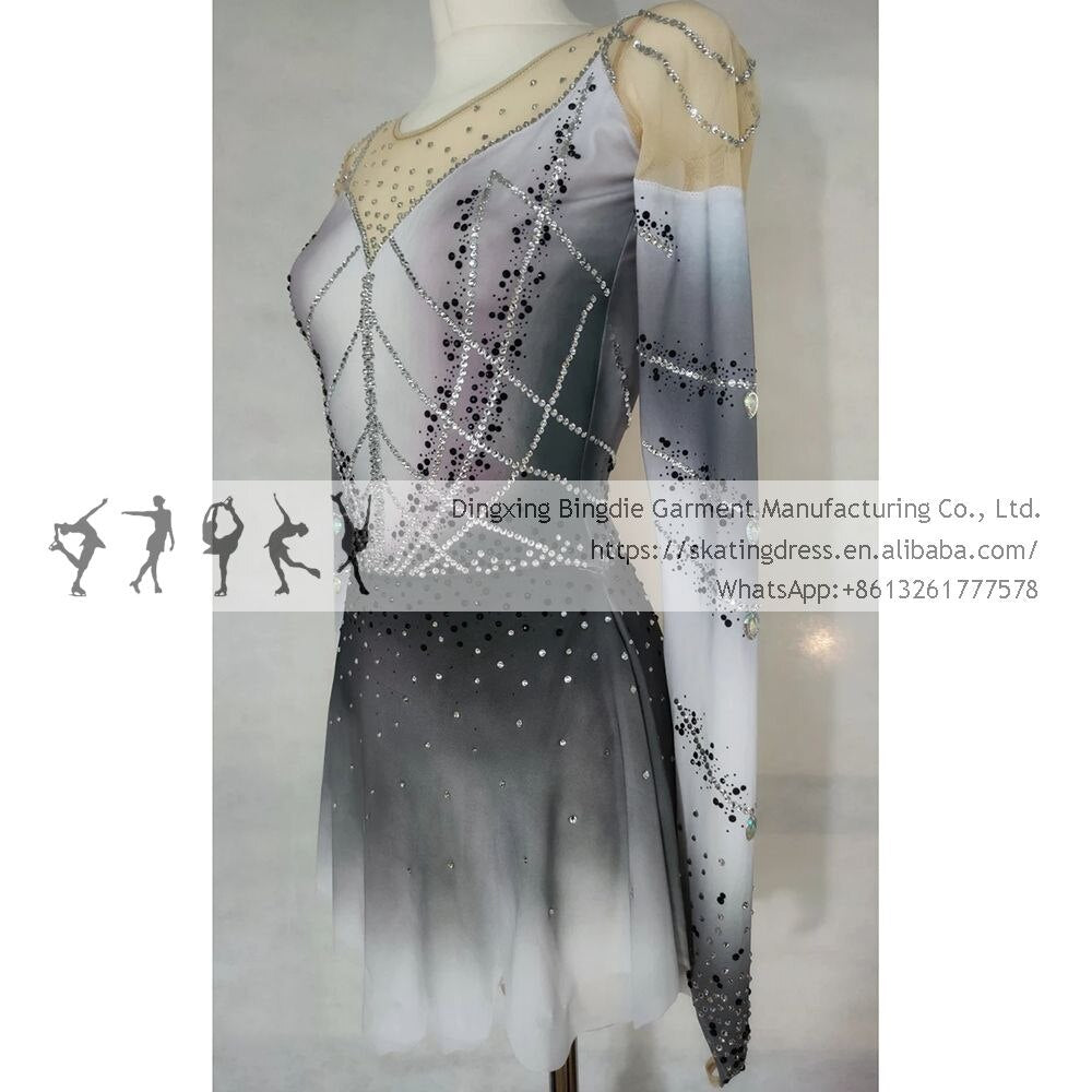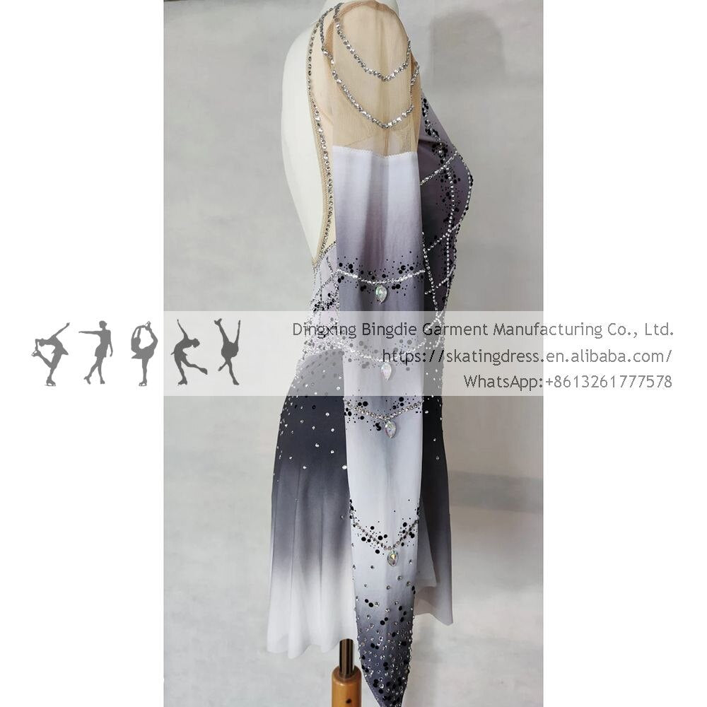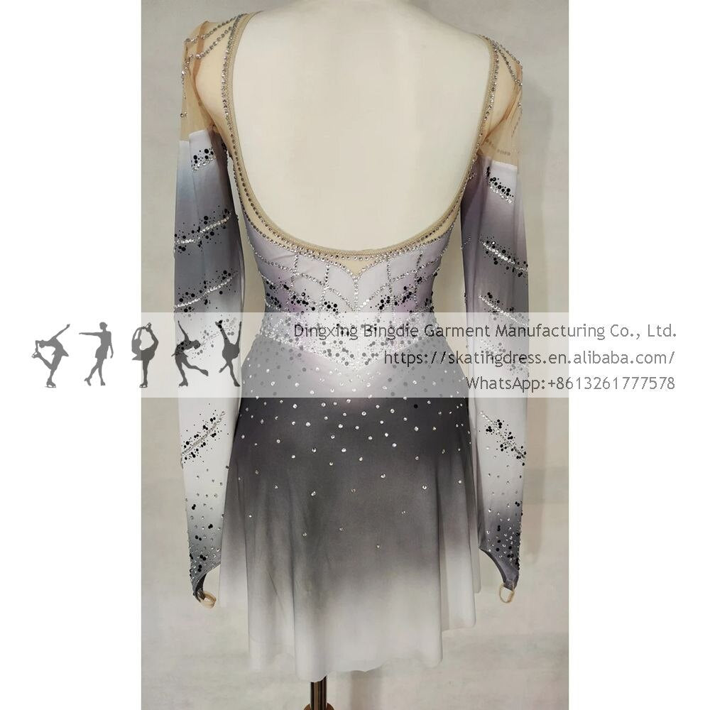 ❤ Features:This LIUHUO skating dress is long - sleeved. It features a gradient color design, transitioning smoothly from light gray to dark gray. The collar and shoulder parts are made of semi - transparent tulle, adding a sense of lightness. The dress is embellished with shiny rhinestones, distributed in geometric lines and dot patterns, highlighting its exquisiteness and luxury. The skirt hem is fishtail - shaped, conforming to the body curve, which is both aesthetically pleasing and convenient for skating. The overall style is elegant and sporty.