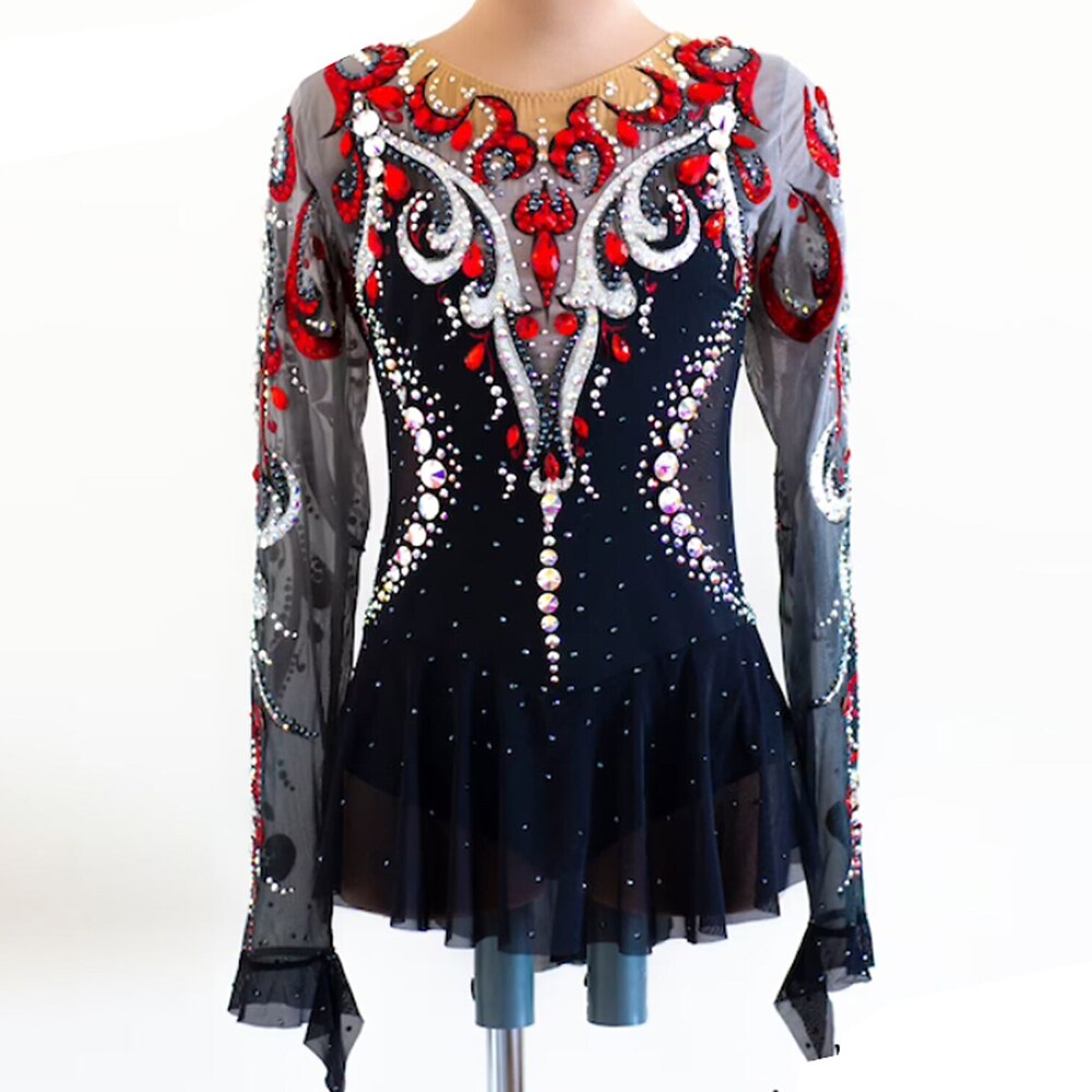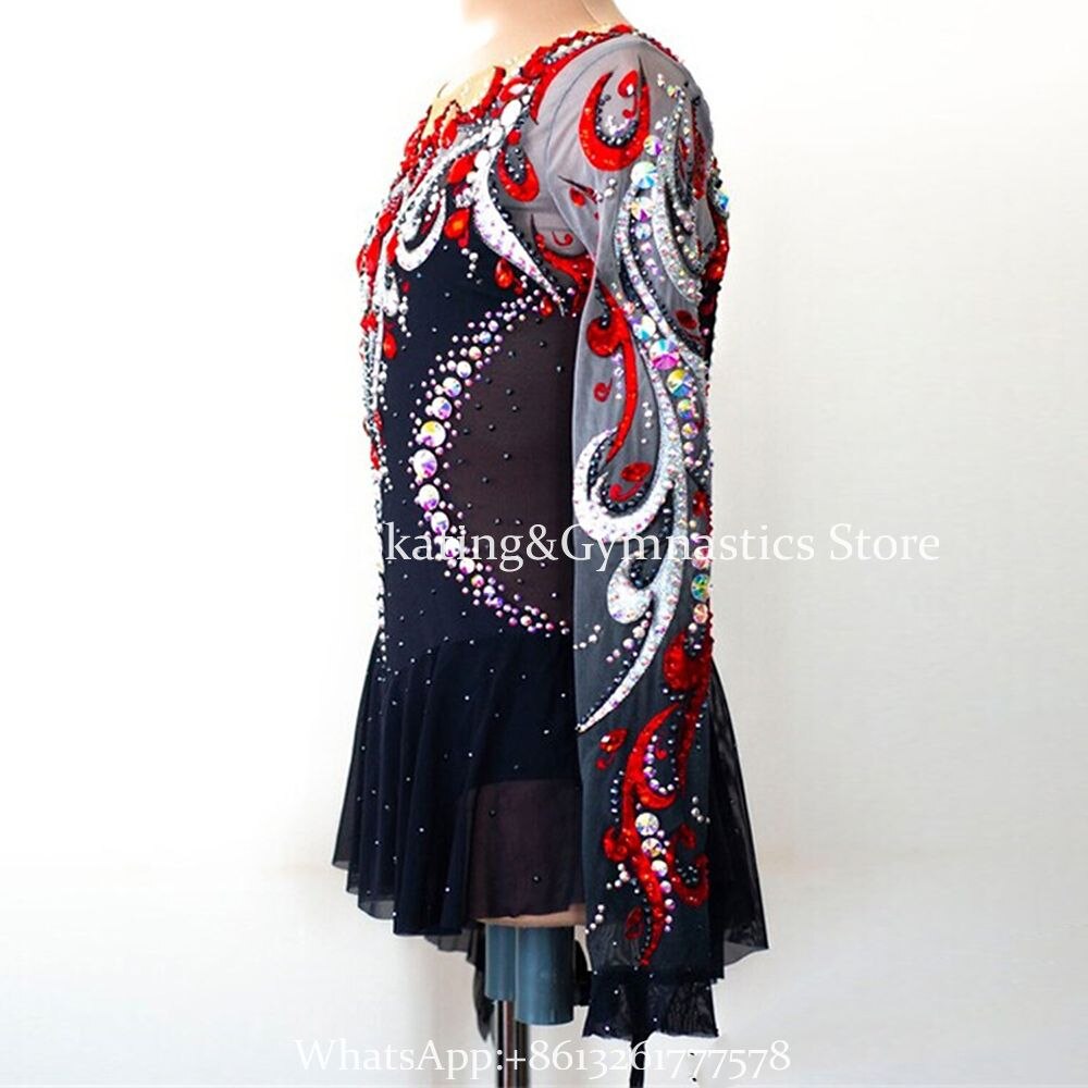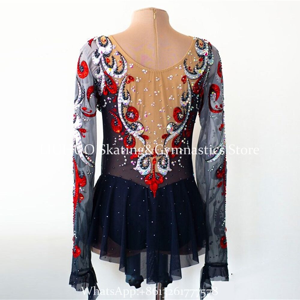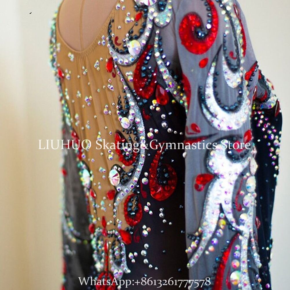 ❤ Features:This LIUHUO figure - skating dress is a masterpiece of elegance and glamour. It features long, sheer sleeves that add a delicate and graceful touch. The bodice is predominantly black, adorned with elaborate patterns crafted from sparkling rhinestones in striking red and white. These embellishments create a visually captivating contrast against the dark base.