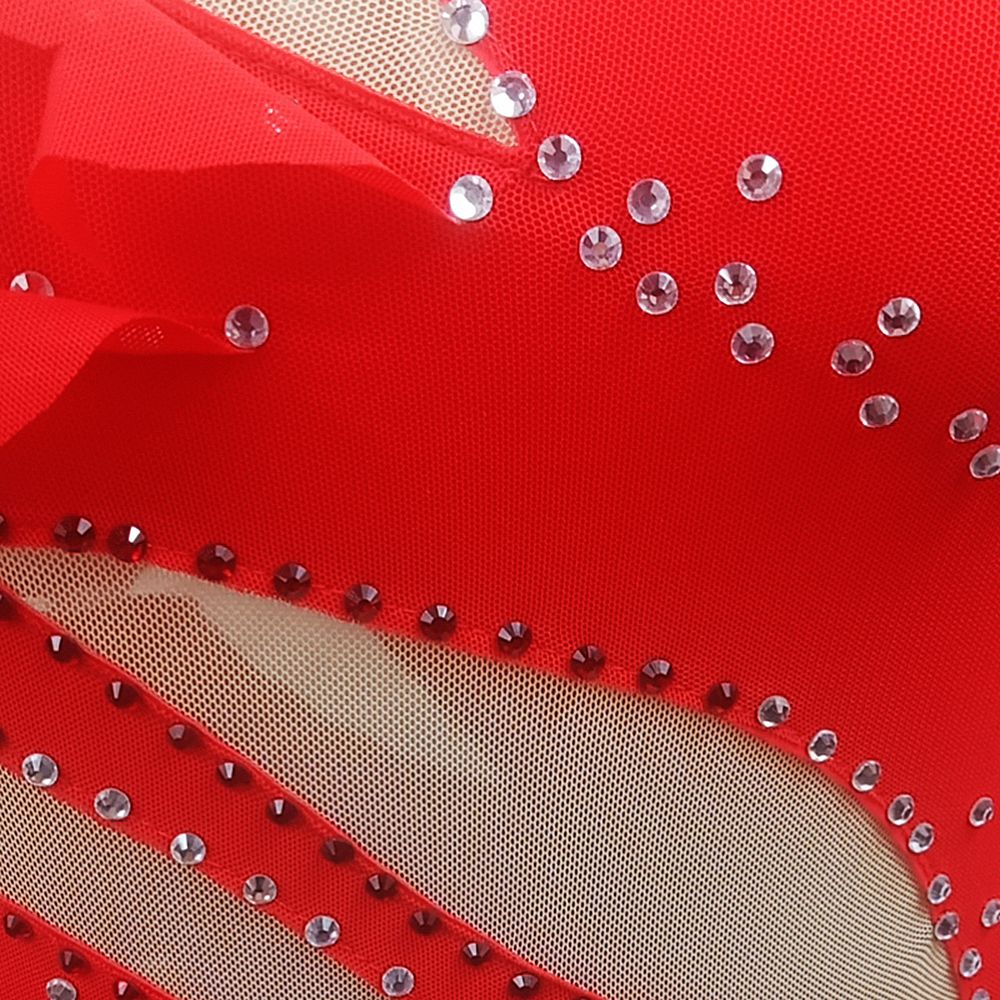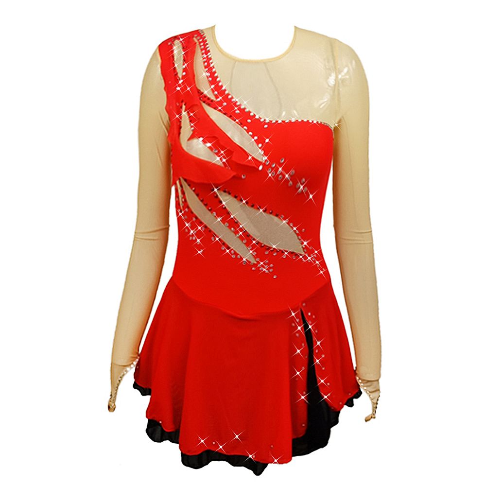 ❤ Features:This LIUHUO figure skating dress is bright red, featuring a unique asymmetric design with sheer beige sleeves and cut - out details adorned with sparkling rhinestones. The skirt has a layered style with a black underskirt, adding a touch of elegance and dynamism for skating performances.