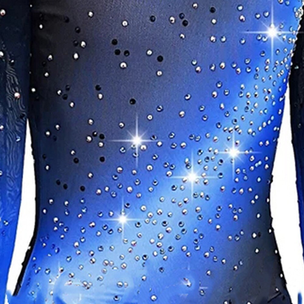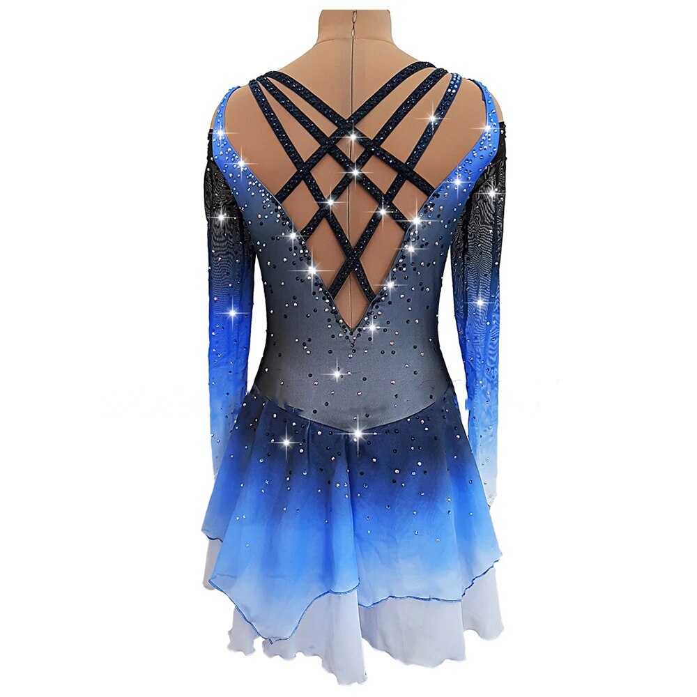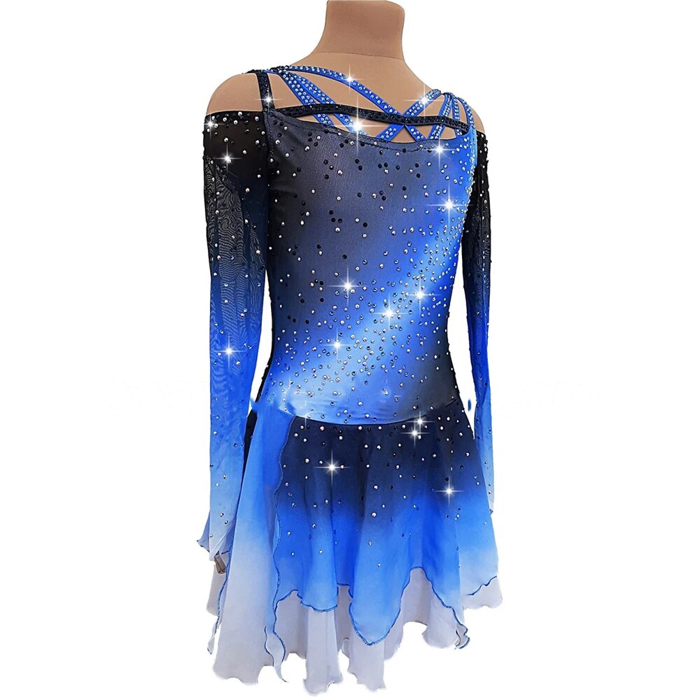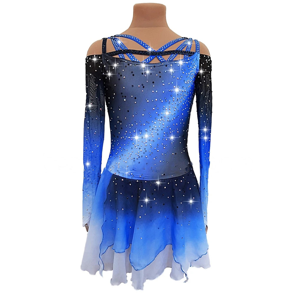 ❤ Features:This is a figure - skating dress of the LIUHUO brand. It has a blue - black gradient main body, a cross - shoulder strap and mesh long - sleeve design, decorated with a large number of rhinestones. It has a gorgeous style and is suitable for figure - skating performances and other scenarios.