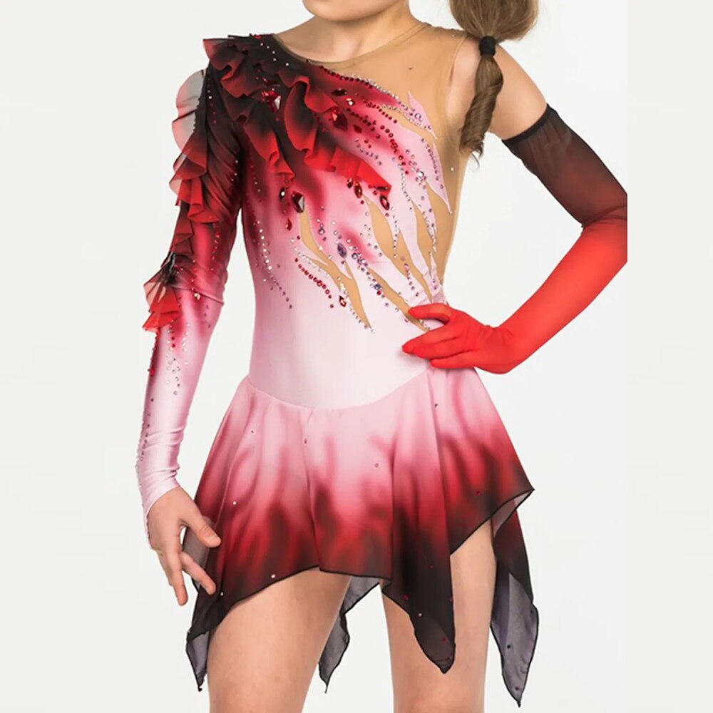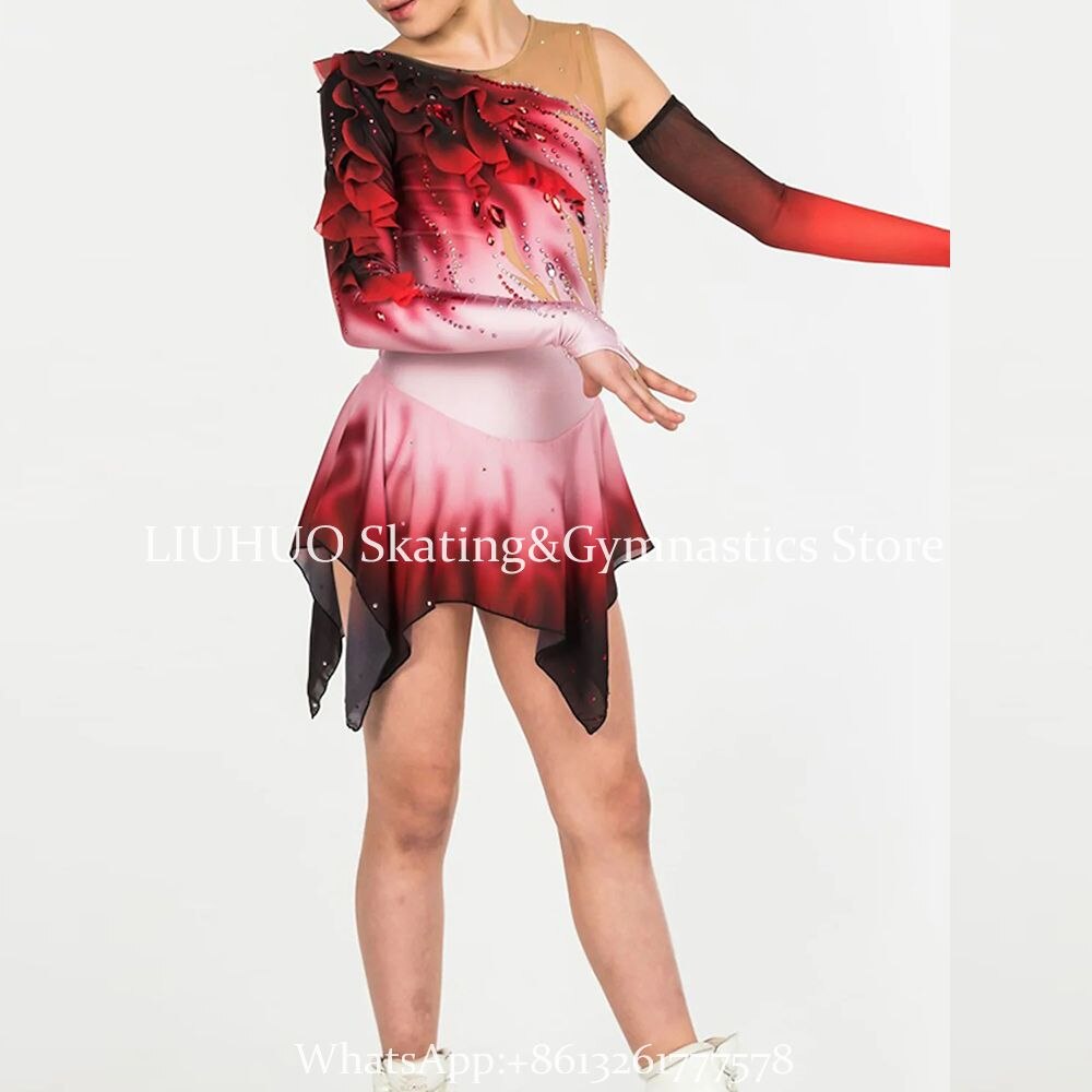 ❤ Features:This LIUHUO figure - skating dress is a striking and dynamic piece. It features a gradient color scheme transitioning from pink to red and black. The one - shoulder design on the left side is adorned with ruffled layers in red, adding texture and movement. This shoulder and the bodice are embellished with sparkling rhinestones and decorative elements, creating an eye - catching pattern.