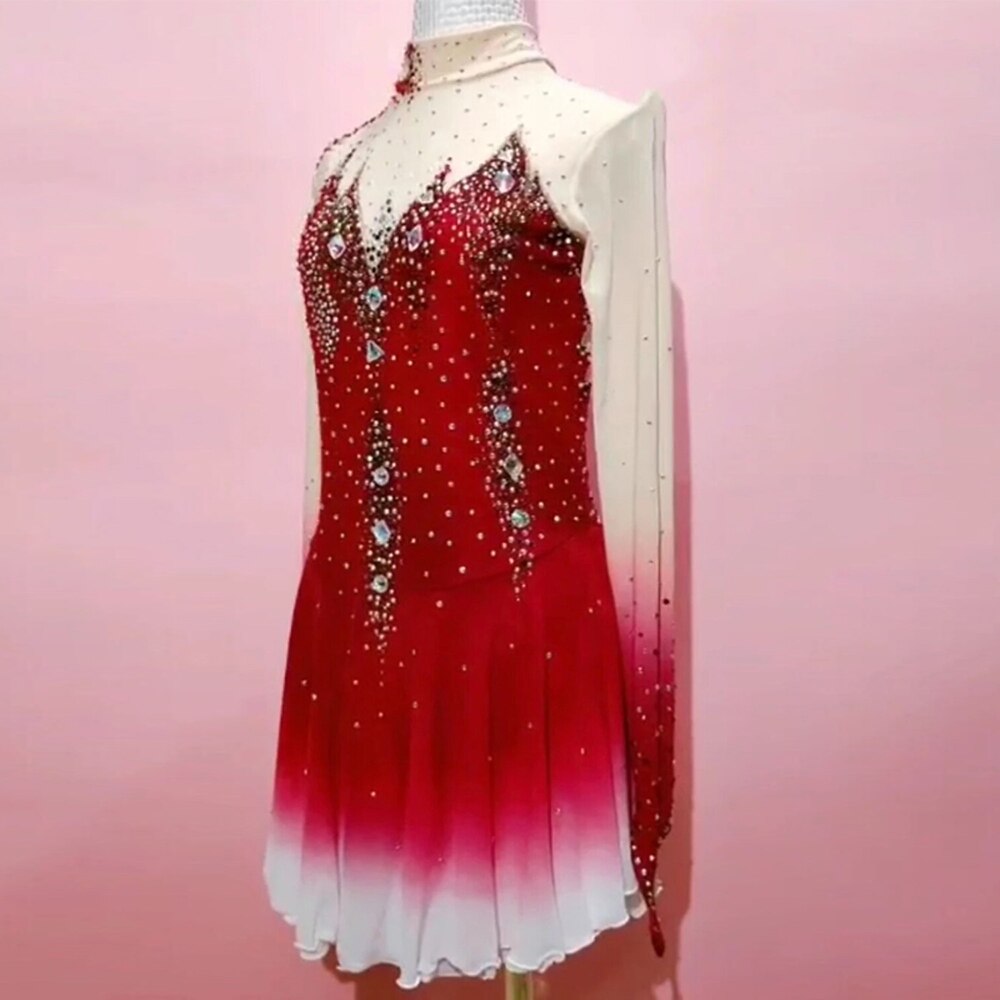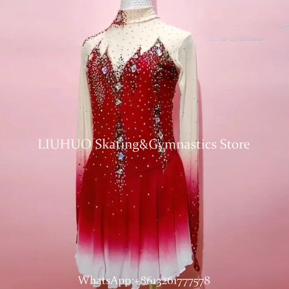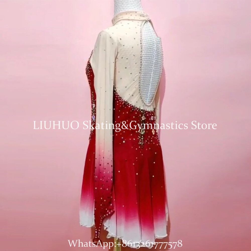 ❤ Features:This LIUHUO figure - skating dress is a vivid and glamorous choice. It showcases a gradient from deep red at the top to white at the bottom of the skirt, creating a striking visual effect. The high - neck design is embellished with numerous small rhinestones, which continue down the front in intricate patterns. Larger, colorful gem - like embellishments are interspersed among the smaller rhinestones, adding extra sparkle. The long, sheer sleeves also feature a gradient and are dotted with rhinestones. The flared skirt allows for ease of movement, making it ideal for ice - skating performances.