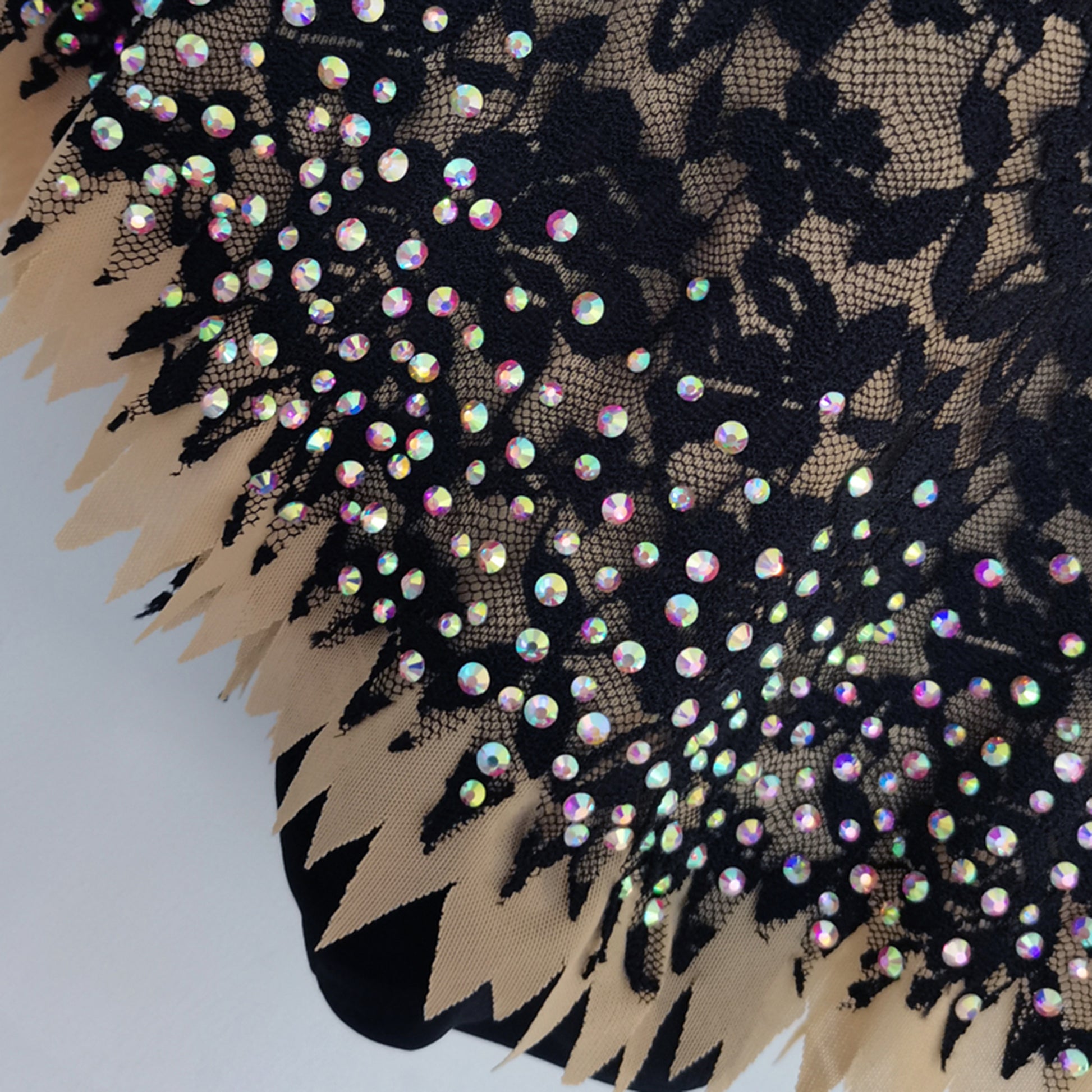 ❤ Features:This LIUHUO gymnastics leotard features a black lace design with sheer beige panels. It’s adorned with sparkling rhinestones, including large, iridescent stones along the sides. The one - shoulder, sleeveless style adds a unique touch, perfect for gymnastics performances.