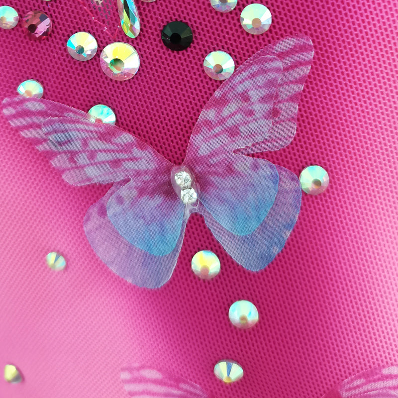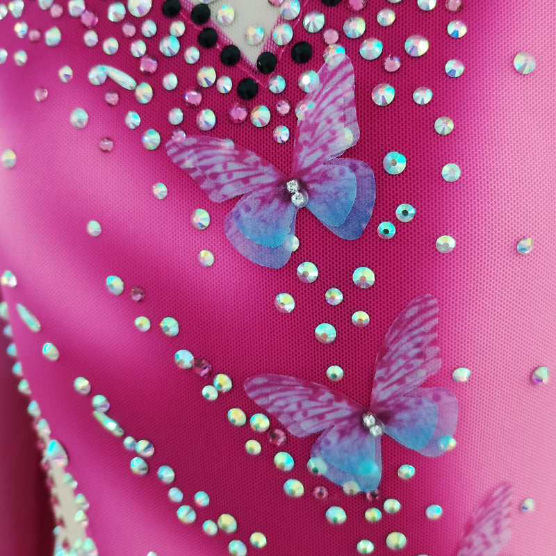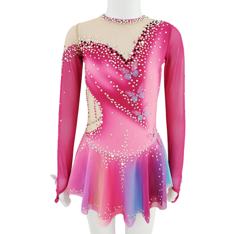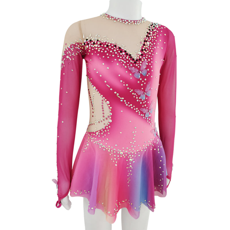❤ Features:This LIUHUO skating dress features long sleeves and a striking gradient of pink hues, transitioning from a deeper pink at the top to a softer, multi - colored blend at the bottom. The bodice is adorned with numerous sparkling rhinestones arranged in elegant patterns, creating a dazzling effect. Delicate butterfly embellishments add a touch of charm and whimsy. The neckline and parts of the sleeves are made of sheer fabric, enhancing the dress's graceful and airy feel. The flared skirt allows for ease of movement, making it perfect for skating performances. Overall, it combines elegance, sparkle, and a sense of movement.