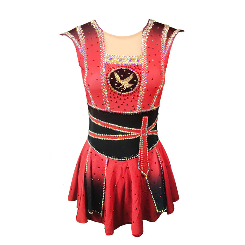 ❤ Features:This sleeveless LIUHUO skating dress is a striking piece. Dominated by a vivid red color with gradient effects, it exudes energy. The bodice is lavishly embellished with numerous sparkling rhinestones, creating an eye - catching pattern. A prominent circular emblem featuring a golden eagle sits at the chest, adding a regal touch.