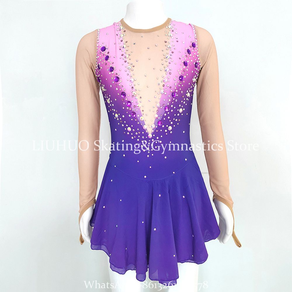 ❤ Features:This LIUHUO figure skating dress is a stunning creation that combines elegance and allure. It showcases a beautiful gradient from pink to purple, creating a captivating visual effect. The long - sleeved sheer panels add a delicate and sophisticated touch. The bodice is lavishly adorned with numerous sparkling rhinestones in shades of purple and silver, meticulously arranged to form an eye - catching pattern around the V - neckline. These embellishments catch the light with every movement, enhancing the dress's charm. The flared skirt allows for graceful gliding on the ice, making it a perfect choice for figure skaters who want to make a memorable impression.