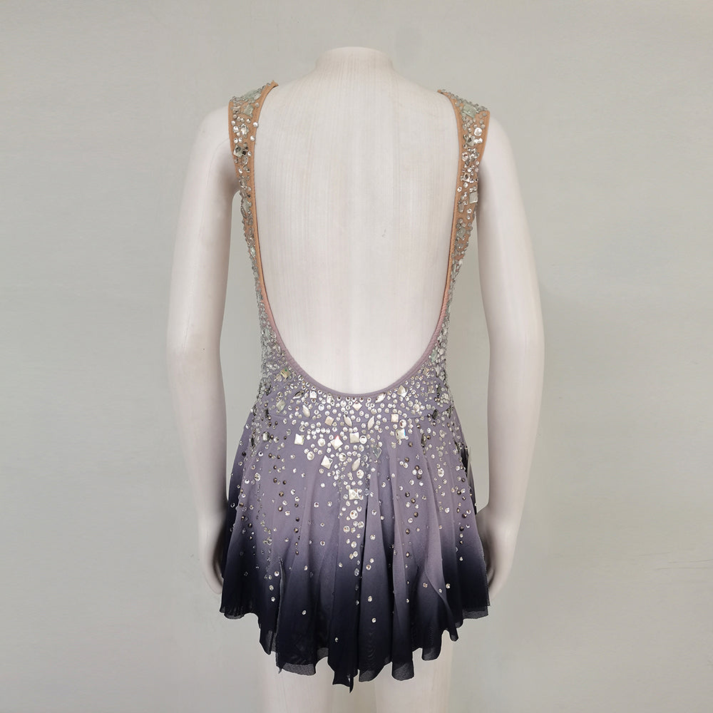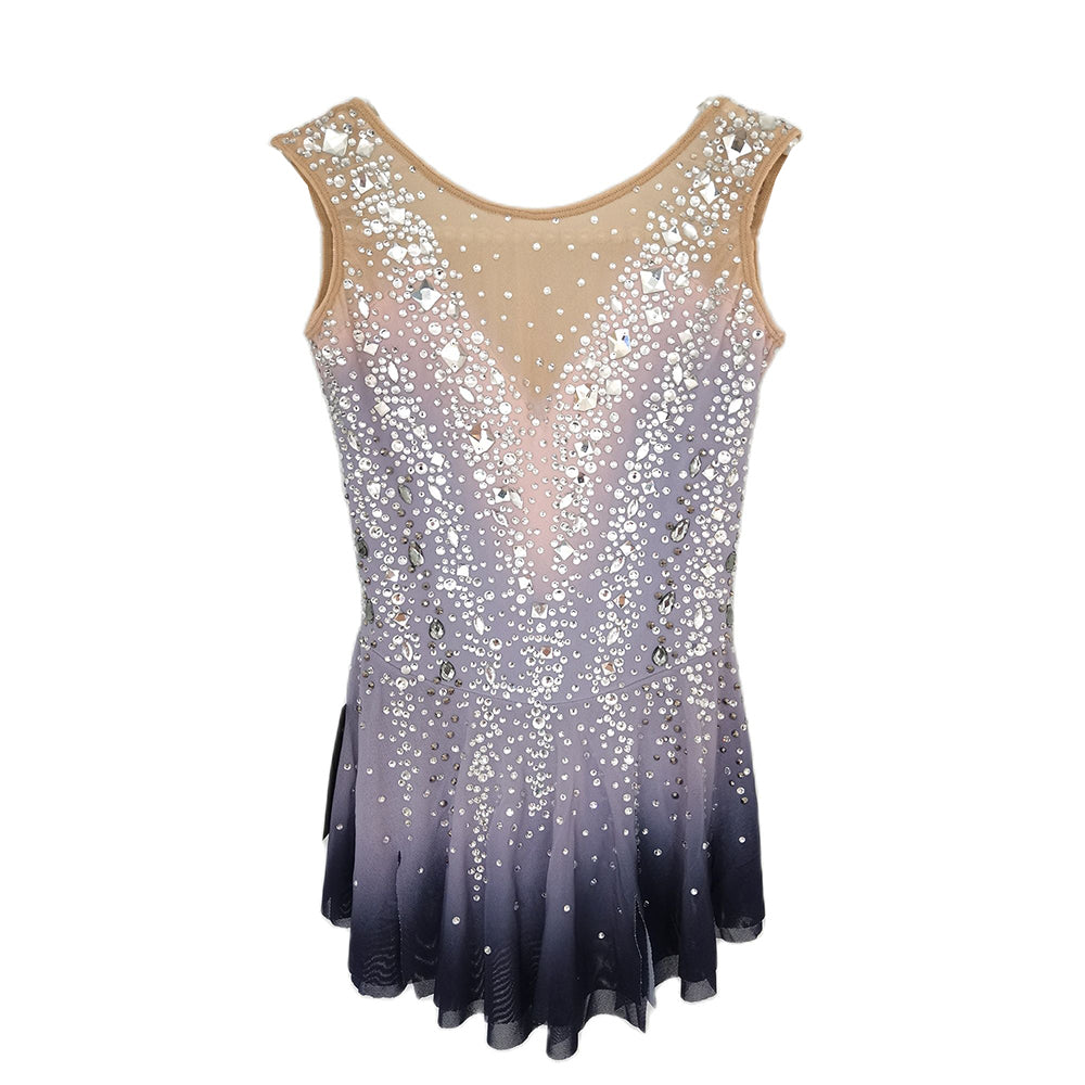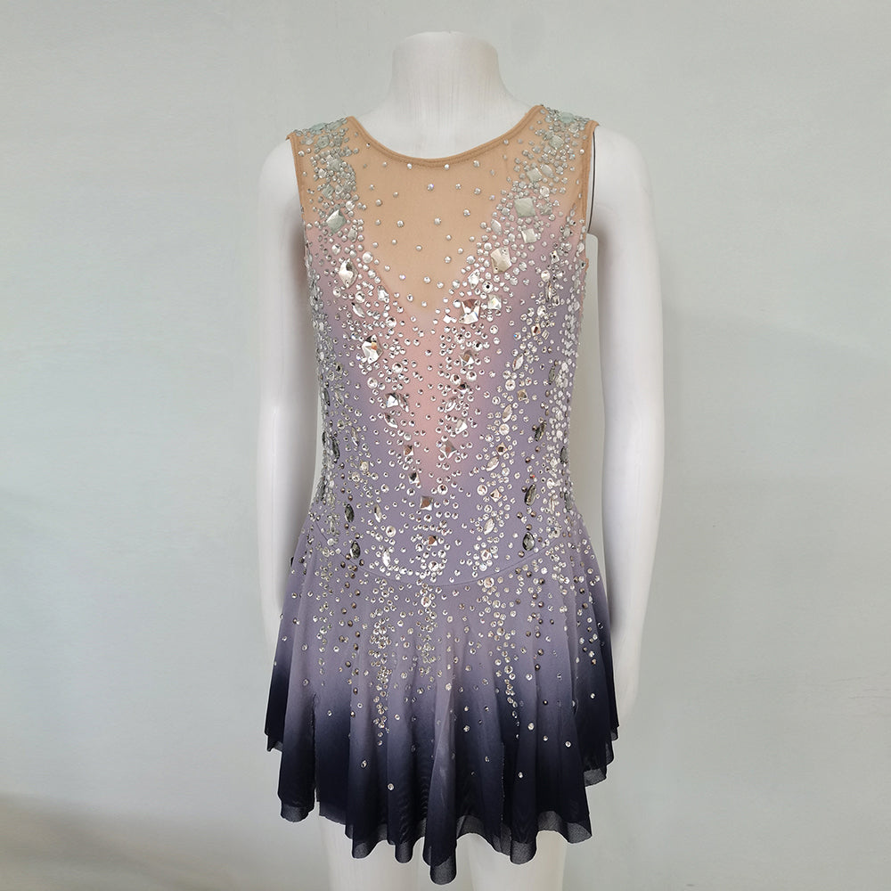 ❤ Features:This LIUHUO figure - skating dress is a paragon of elegance and sparkle. It features a sleeveless design with a sheer, nude - colored upper bodice that seamlessly transitions into a gradient of light to dark purple towards the skirt. The entire dress is lavishly adorned with an abundance of sparkling rhinestones and reflective sequins. These embellishments are meticulously arranged in patterns that cascade down the bodice, creating a dazzling effect. The flared skirt allows for graceful movement on the ice, making this dress a perfect choice for captivating figure - skating performances.