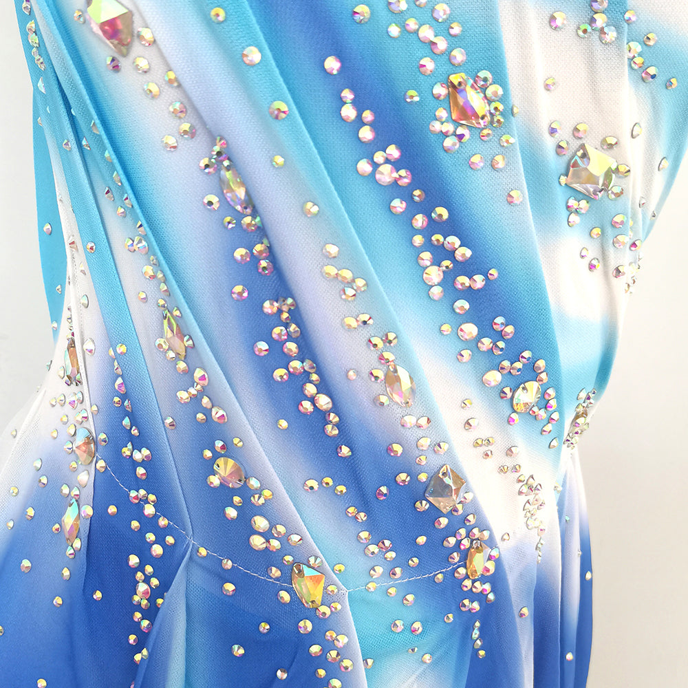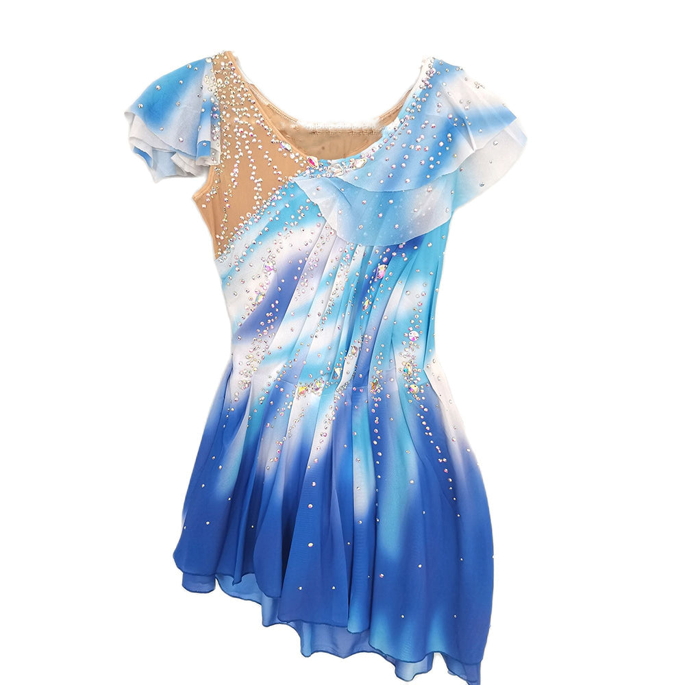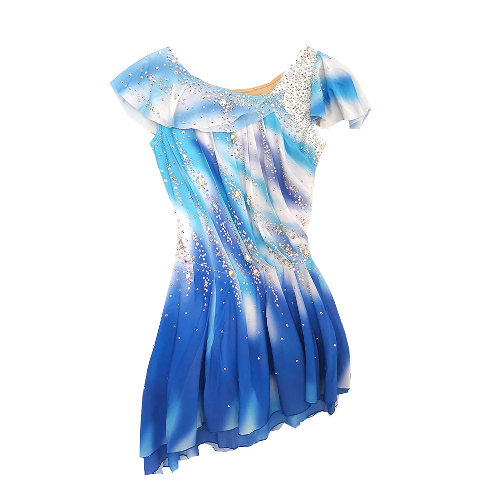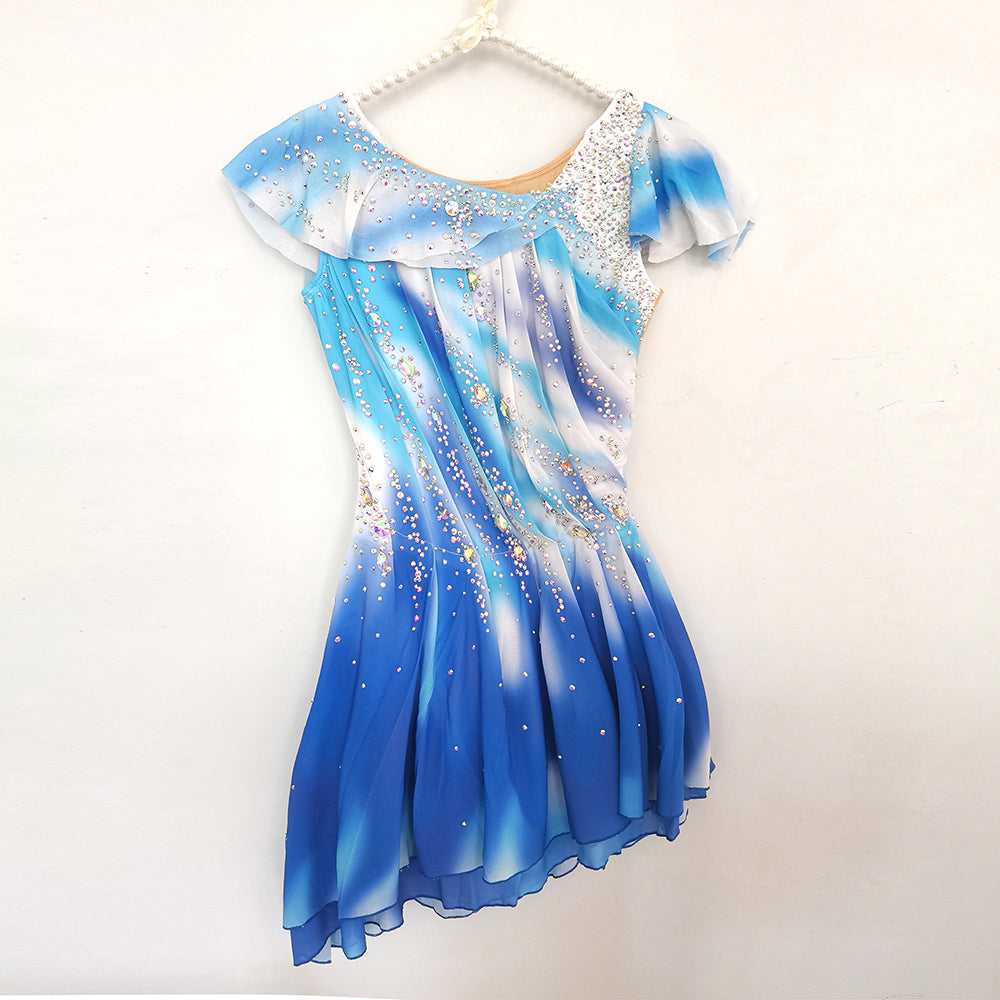 ❤ Features:This LIUHUO figure - skating dress is a charming and eye - catching piece. It showcases a beautiful gradient of blue hues, transitioning smoothly from light to dark, which evokes a sense of tranquility and elegance. The off - the - shoulder design with ruffled sleeves adds a touch of femininity and grace. The dress is adorned with numerous sparkling rhinestones, which are meticulously arranged to create a dazzling effect, enhancing its visual appeal. The flared skirt, made of flowing fabric, allows for unrestricted movement on the ice, making it an ideal choice for figure - skating performances.