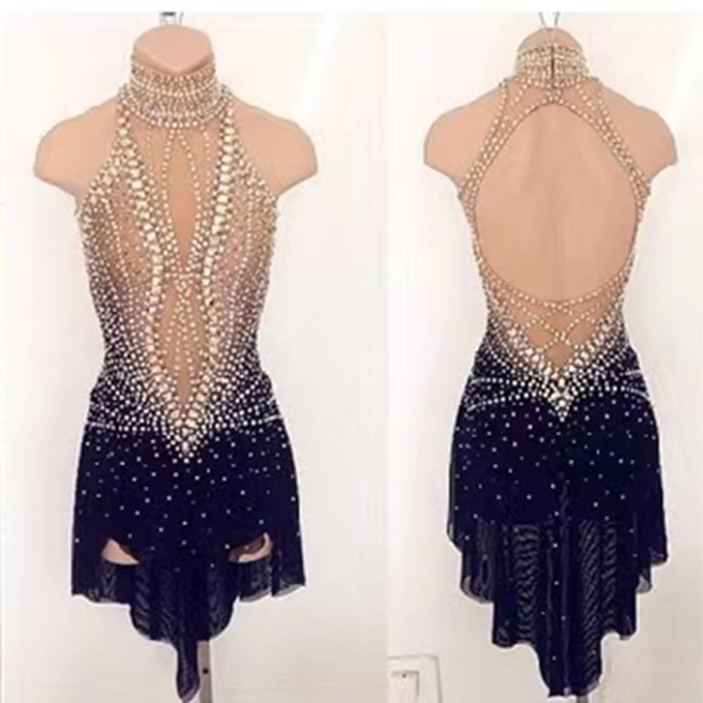 ❤ Features:This LIUHUO figure - skating dress is a masterpiece of elegance and allure. The front showcases a halter - style neckline with sheer fabric, creating a sophisticated peek - a - boo effect. It's adorned with an abundance of sparkling rhinestones meticulously arranged in floral and abstract patterns, all set against a mesmerizing gradient of blue hues that evoke the image of a serene icy landscape. The back features an eye - catching large cut - out, framed by more rhinestones, adding a bold and glamorous touch. Long, sheer sleeves complete the look, while the flared skirt allows for graceful movement on the ice, making it perfect for a standout performance.