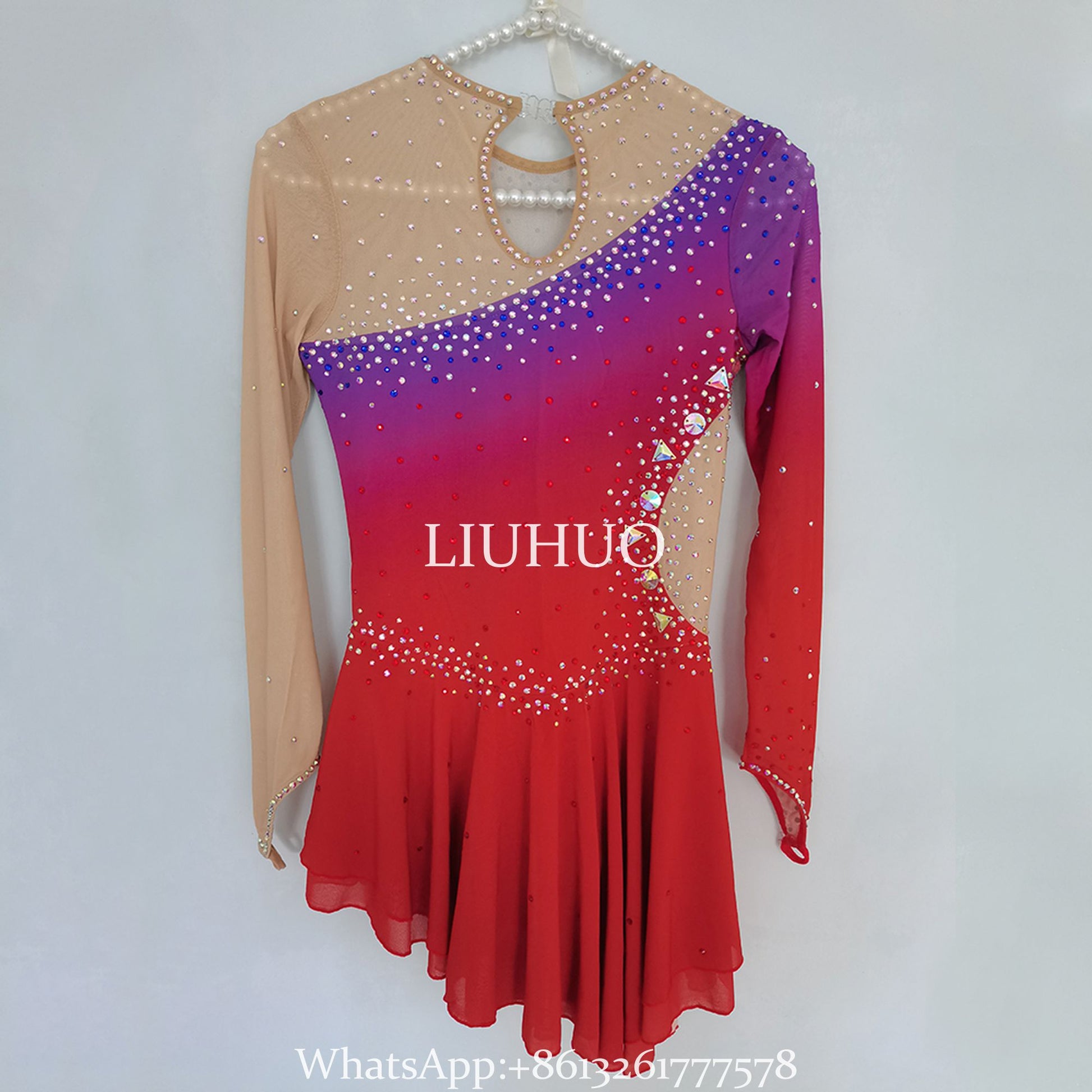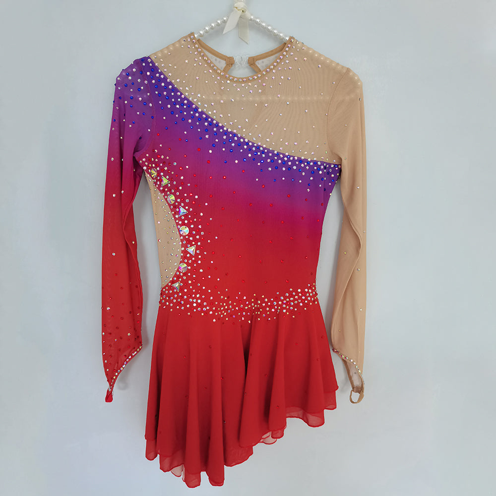 ❤ Features:This LIUHUO figure - skating dress is a vibrant and eye - catching piece. It features a stunning gradient color scheme transitioning from red to purple, creating a dynamic visual effect. The sheer fabric on the upper part and sleeves adds an elegant and delicate touch. The dress is lavishly embellished with numerous sparkling rhinestones, meticulously arranged to enhance its allure. The asymmetrical design of the skirt adds a modern flair, allowing for graceful movement on the ice. It perfectly combines style and functionality, making it an ideal choice for figure - skating performances.