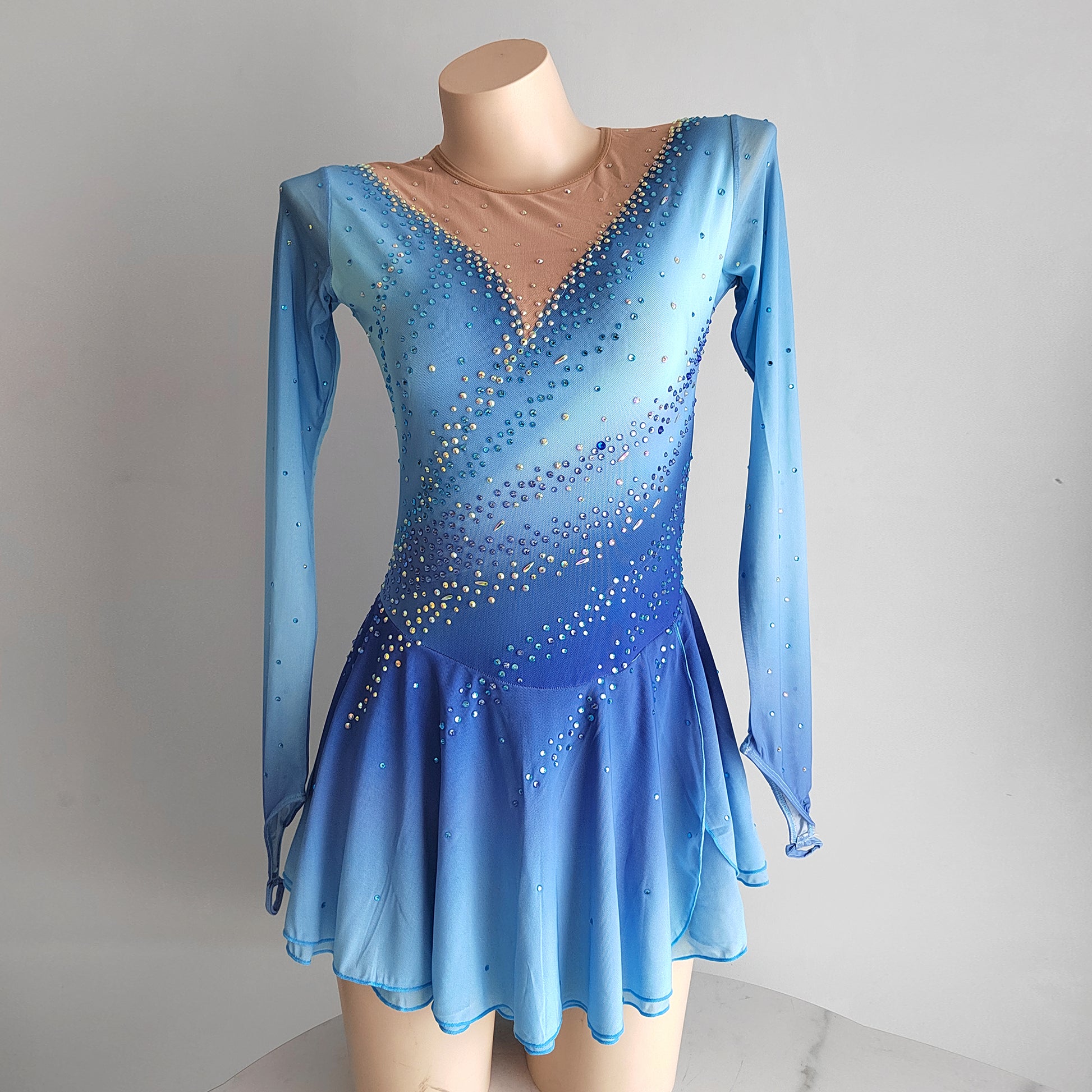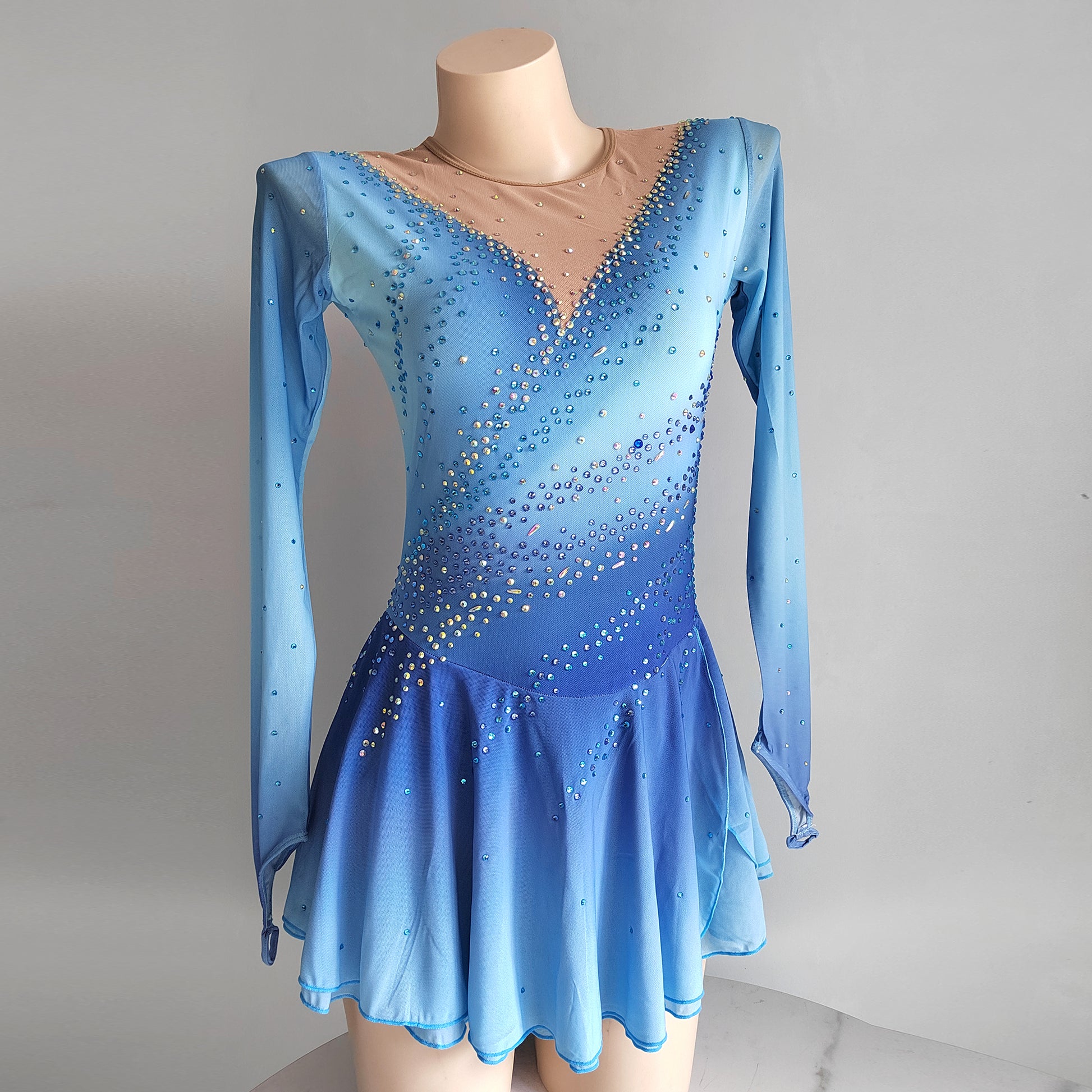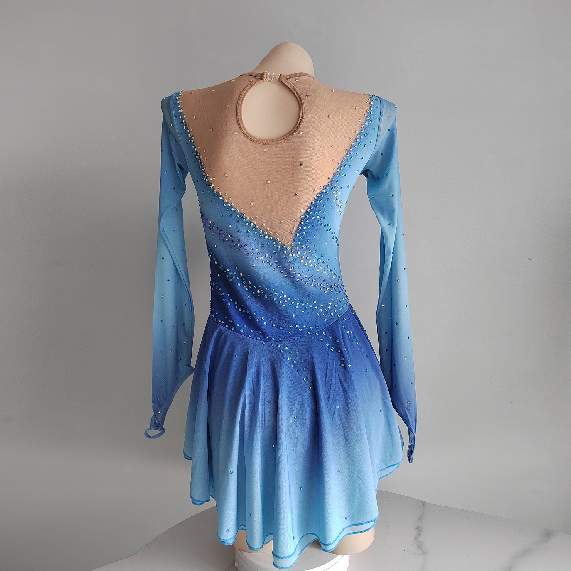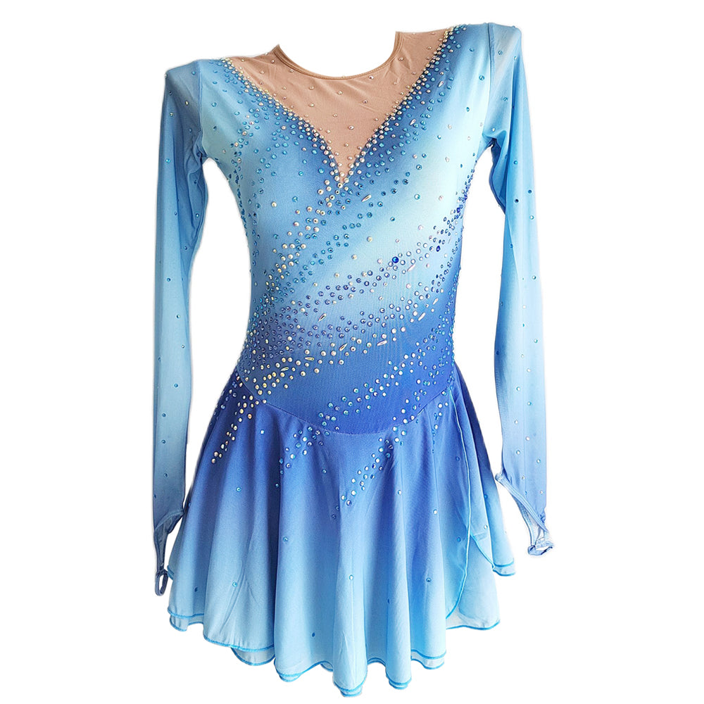 ❤ Features:This LIUHUO figure - skating dress is a vision of grace and beauty. With a dreamy gradient of light blue hues, it evokes the serene image of a winter sky. The long, sheer sleeves add an ethereal touch, while the V - neckline is adorned with sparkling rhinestones that cascade down the bodice. These embellishments are meticulously placed, creating a dazzling effect that catches the light with every movement. The flared skirt, made of flowing fabric, allows for unrestricted motion on the ice, making this dress an ideal choice for skaters looking to shine in their performances.
