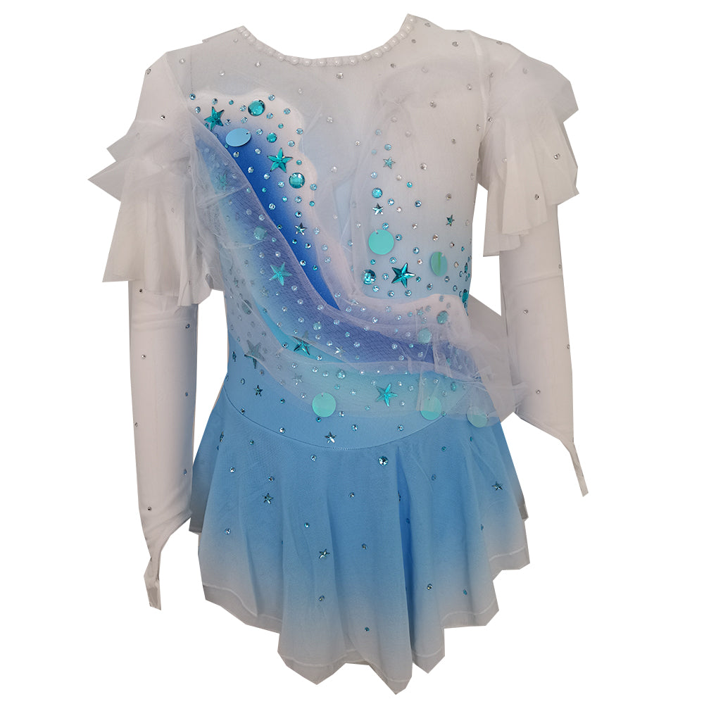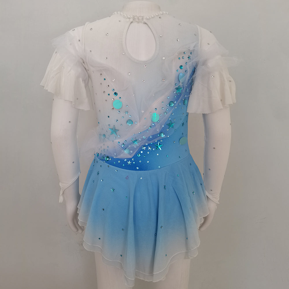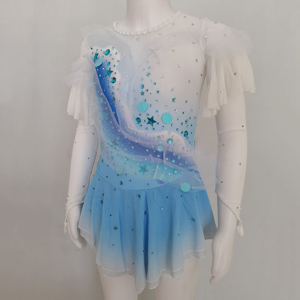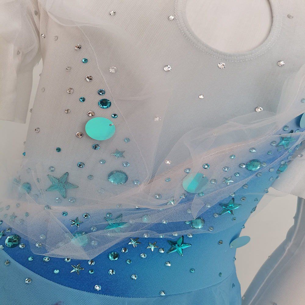 ❤ Features:This LIUHUO figure - skating dress is a charming and whimsical piece. It features a soft gradient from white to light blue, reminiscent of a clear sky transitioning into a serene ocean. The long sleeves are adorned with delicate ruffled layers, adding a touch of elegance and movement. The bodice is decorated with an array of sparkling rhinestones, along with star - shaped and circular embellishments in shades of blue, creating a celestial - inspired design. The flared skirt, made of flowing fabric, complements the overall look, allowing skaters to glide gracefully on the ice while radiating a dreamy and enchanting aura.