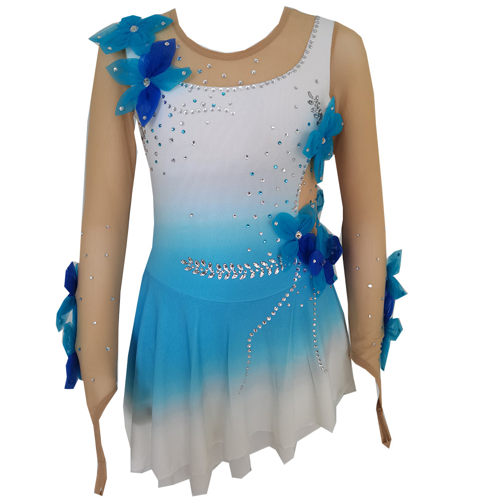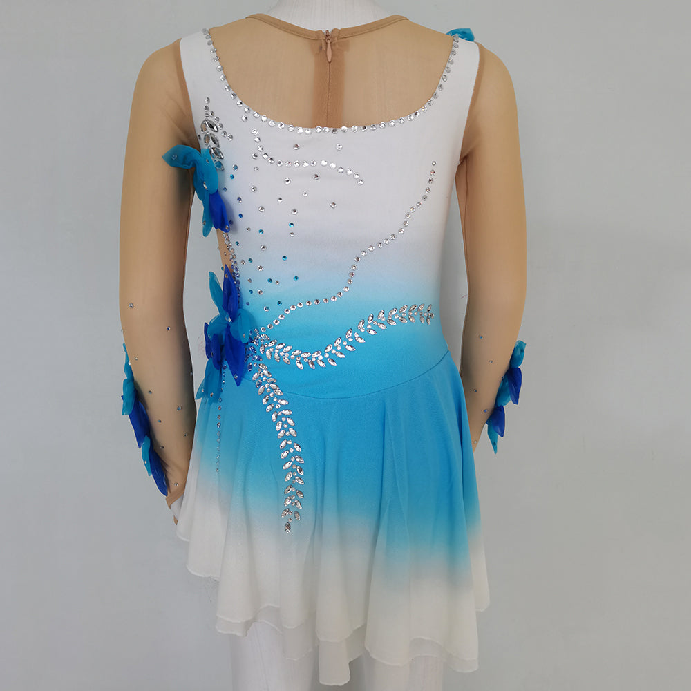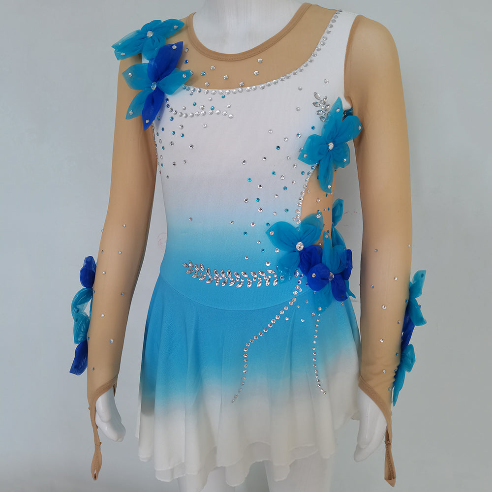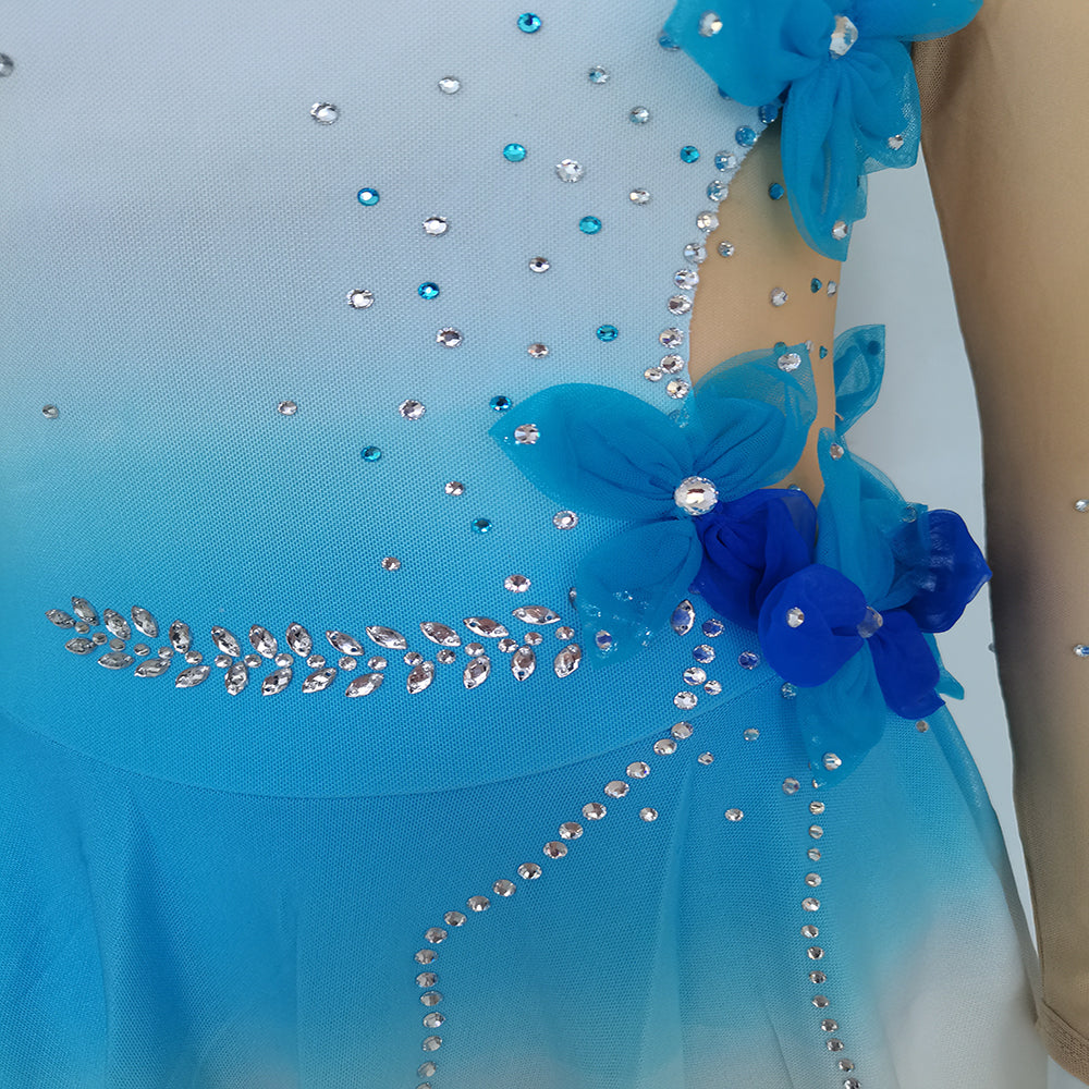 ❤ Features:This LIUHUO figure - skating dress is a harmonious blend of elegance and charm. It showcases a beautiful gradient from white to blue, reminiscent of a clear sky meeting the ocean. The sleeveless bodice is adorned with sparkling rhinestones, adding a touch of glamour. Large, vivid blue flowers with gem - studded centers embellish the dress, both on the bodice and along the sleeves, infusing a natural, whimsical element. The sheer sleeves and flared skirt, crafted from flowing fabric, allow for graceful movement on the ice, making it a perfect choice for skaters aiming to dazzle during their performances.
