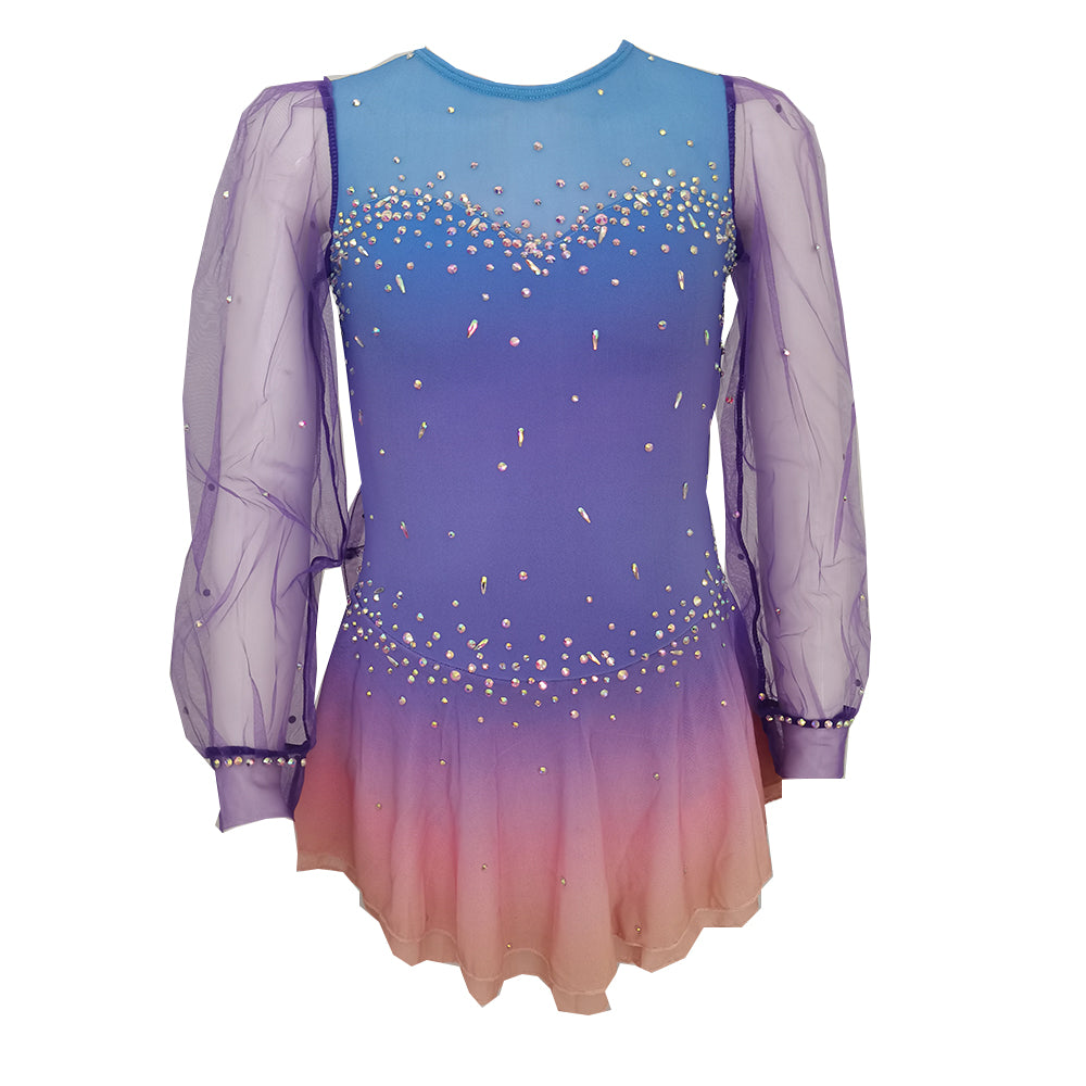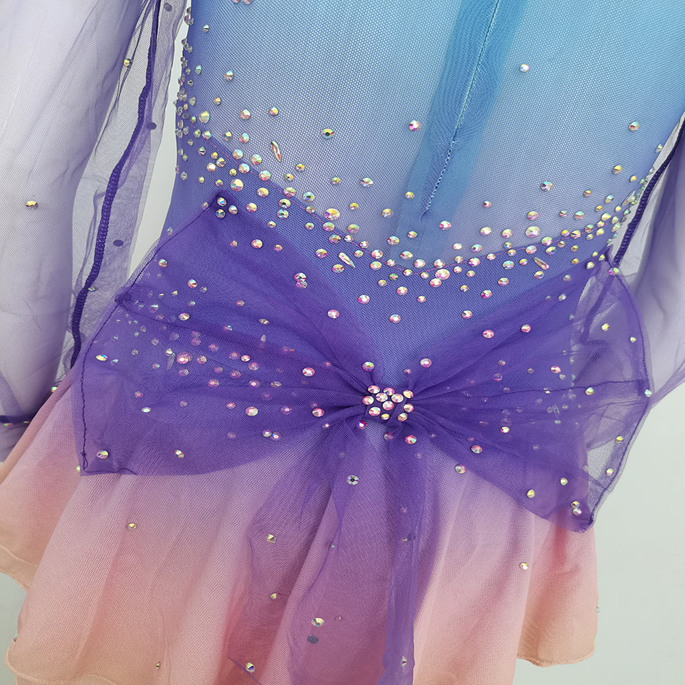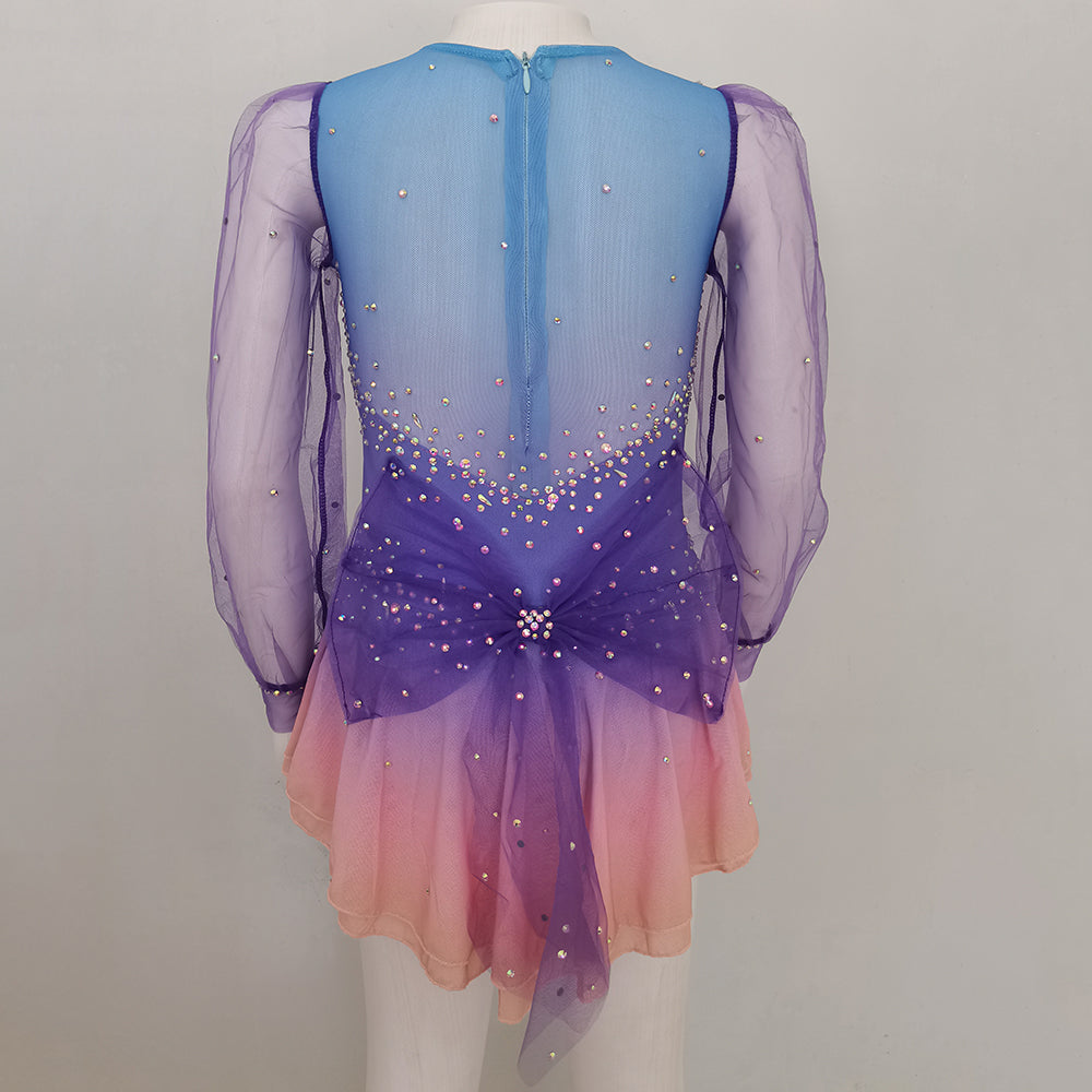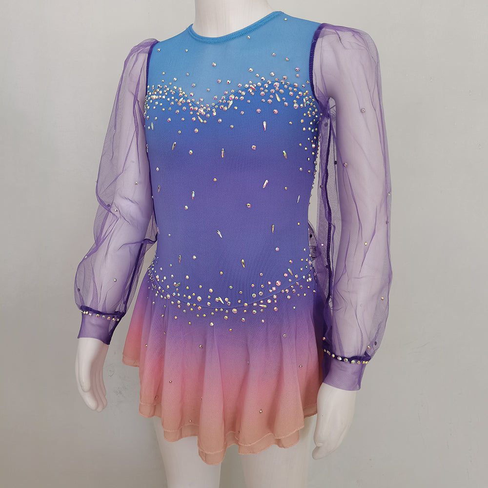❤ Features:This skating dress from LIUHUO is a vision of grace and beauty. It showcases a mesmerizing gradient transitioning from blue at the top to a soft pink at the hem. The bodice is embellished with an array of sparkling rhinestones, adding a touch of glamour. The long, sheer puff sleeves, also dotted with rhinestones, exude a romantic and ethereal charm. This dress is not only a functional choice for skating but also a statement piece that combines style and elegance.