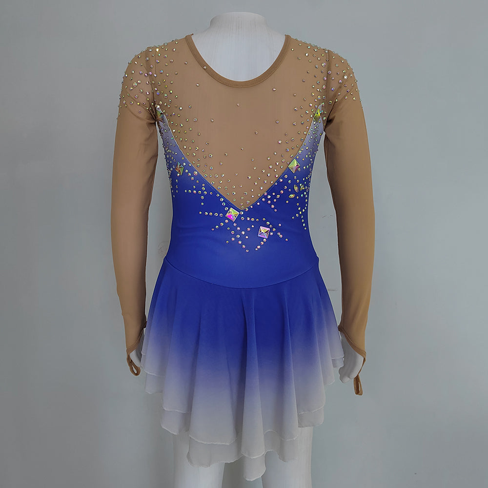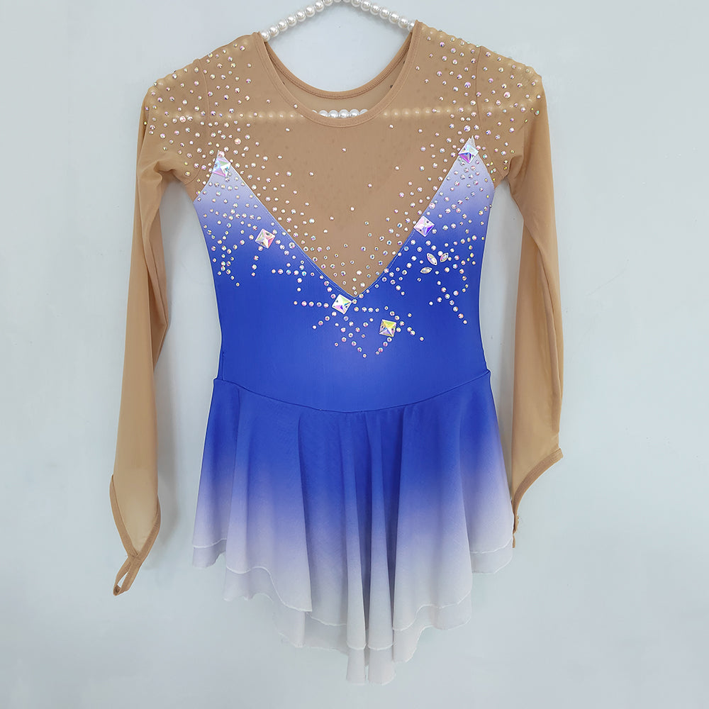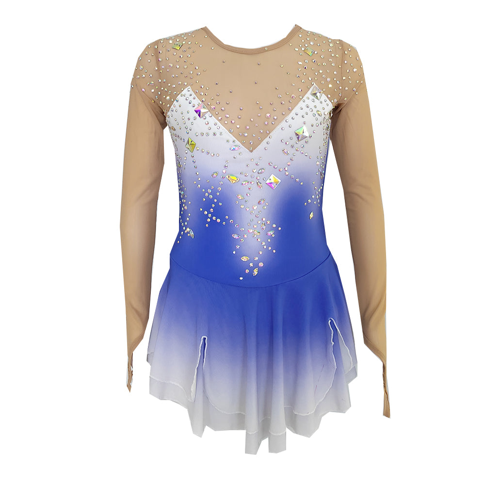 ❤ Features:This LIUHUO skating dress is a harmonious blend of elegance and sparkle. It features a gradient transitioning from white to blue, creating a visually appealing effect. The sheer upper part and long sleeves, along with the bodice, are lavishly adorned with numerous rhinestones in various shapes and sizes, catching the light with every movement. The flared skirt adds a sense of grace, making it an ideal choice for skaters who want to shine on the ice.
