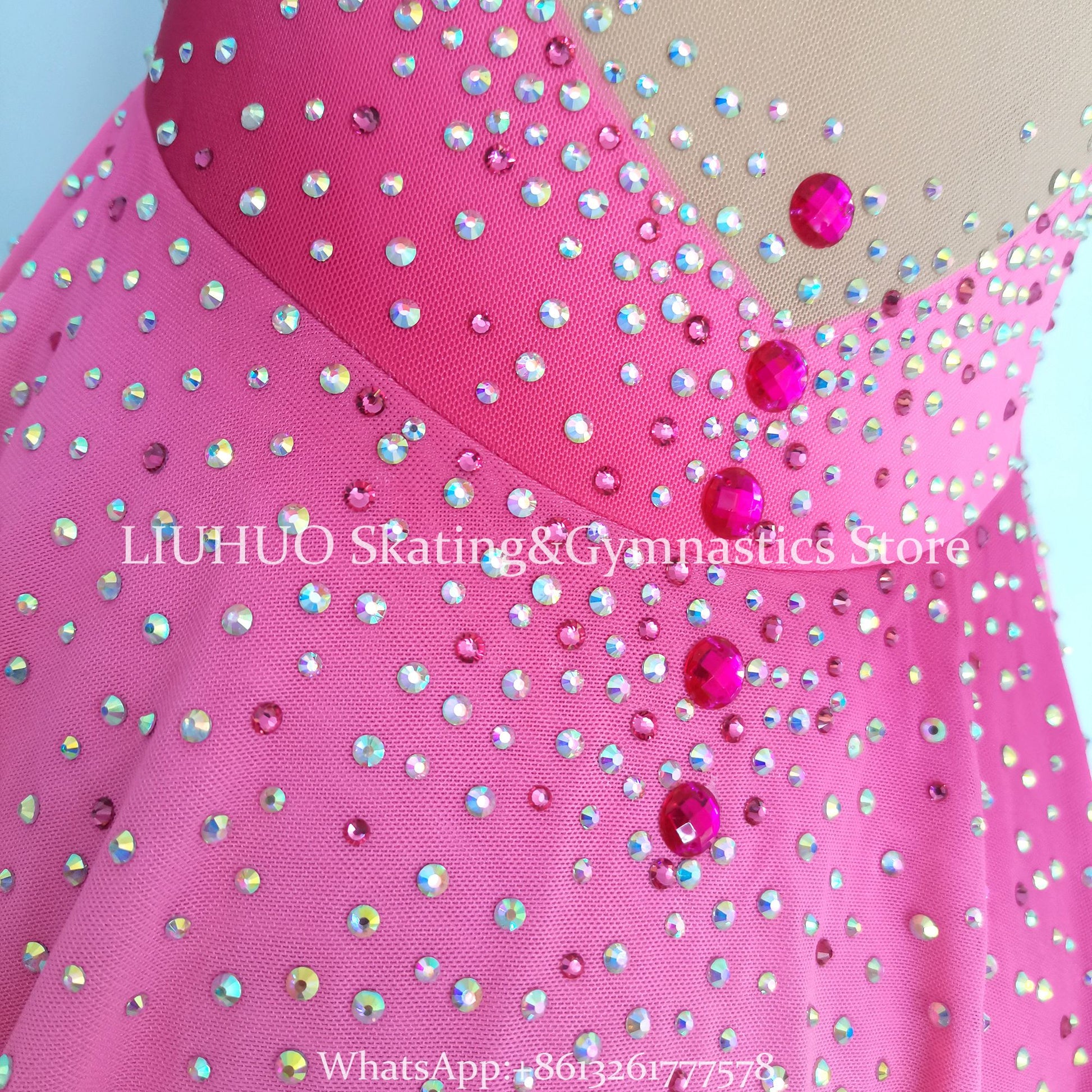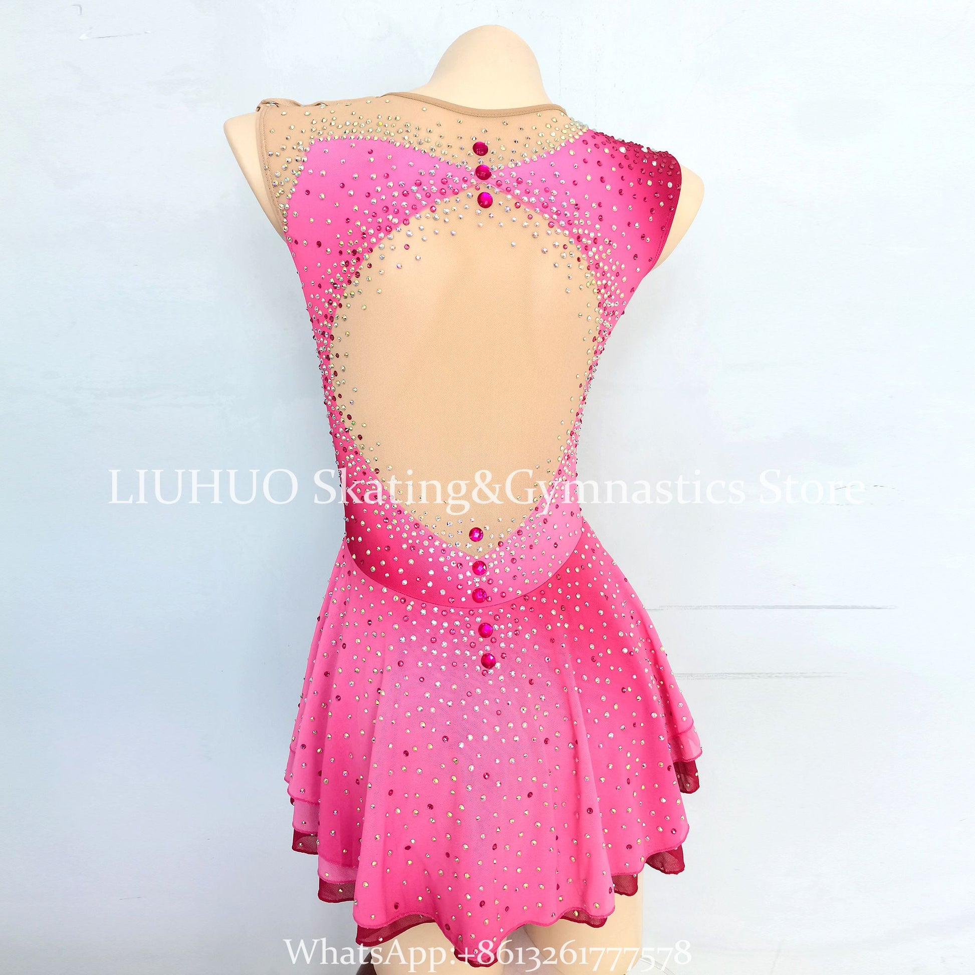 ❤ Features:This LIUHUO skating dress is a dazzling and vibrant creation. It features a striking gradient from a deep pink at the top to a lighter pink towards the flared skirt. The sleeveless design showcases a sheer panel at the neckline, embellished with countless sparkling rhinestones meticulously arranged in intricate patterns. These rhinestones cover the entire bodice and skirt, catching and reflecting light from every angle. The overall design combines elegance and sparkle, making it a perfect choice for skaters aiming to shine on the ice.