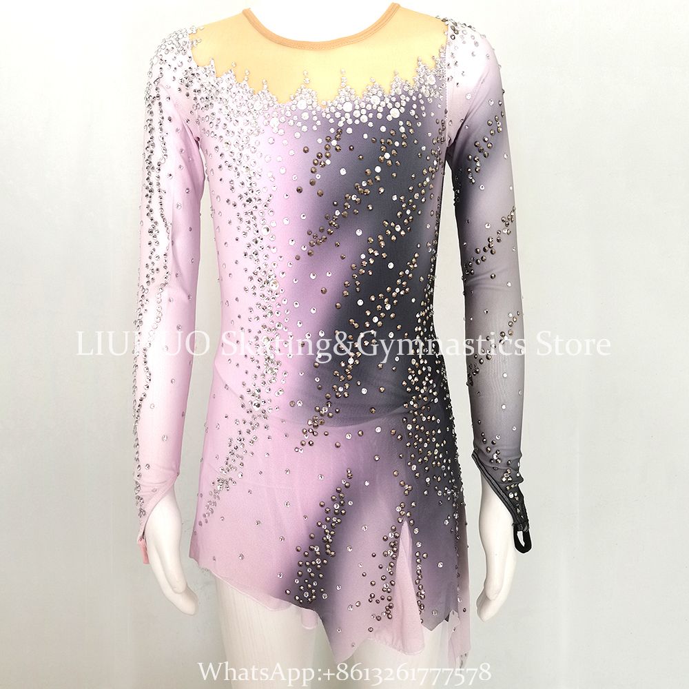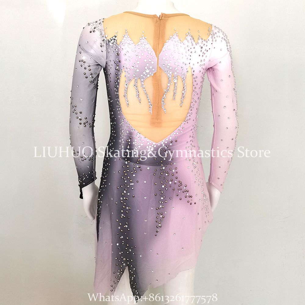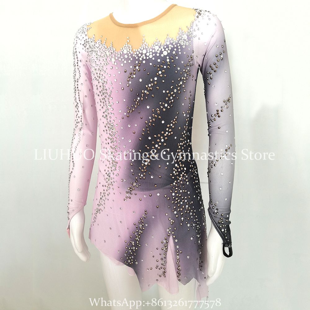 ❤ Features:This LIUHUO figure skating dress is a paragon of grace and glamour. It showcases a soft, dreamy gradient transitioning from a gentle pink to a subtle grey, creating an ethereal look. The long - sleeved design features sheer fabric that adds a touch of allure. The dress is lavishly embellished with countless sparkling rhinestones, meticulously arranged in patterns that enhance its visual appeal. These rhinestones catch the light beautifully, making the skater shine on the ice. With its unique color scheme and exquisite embellishments, it's an ideal choice for those seeking both style and elegance in figure skating.