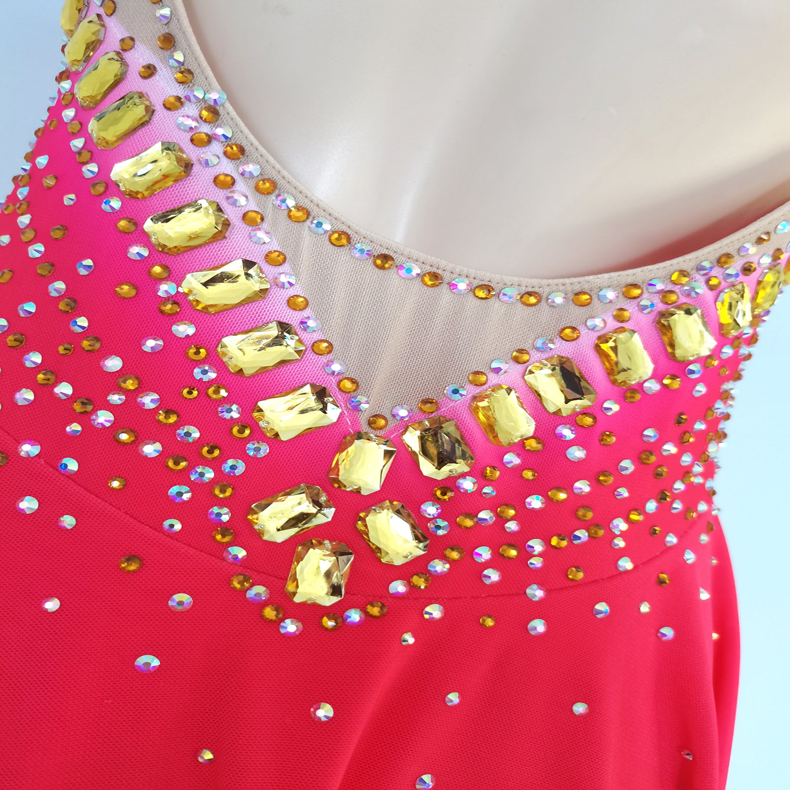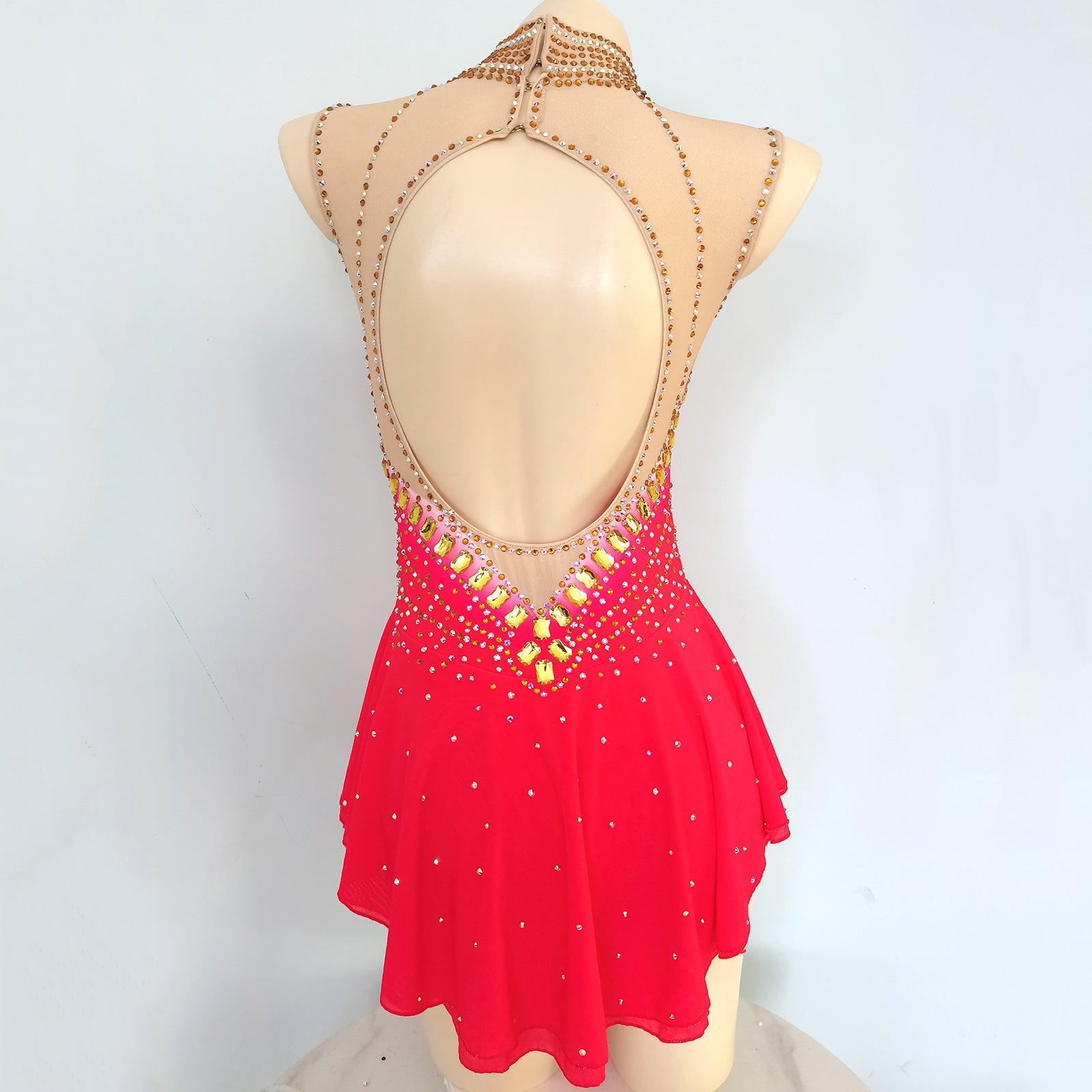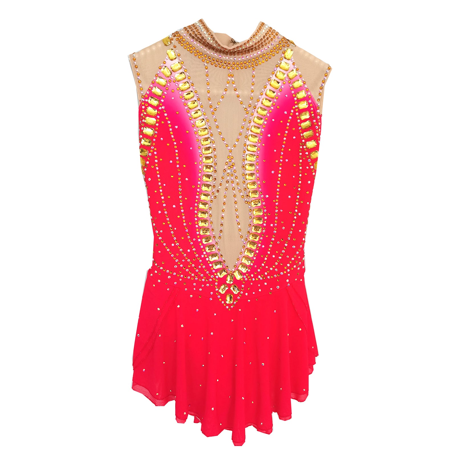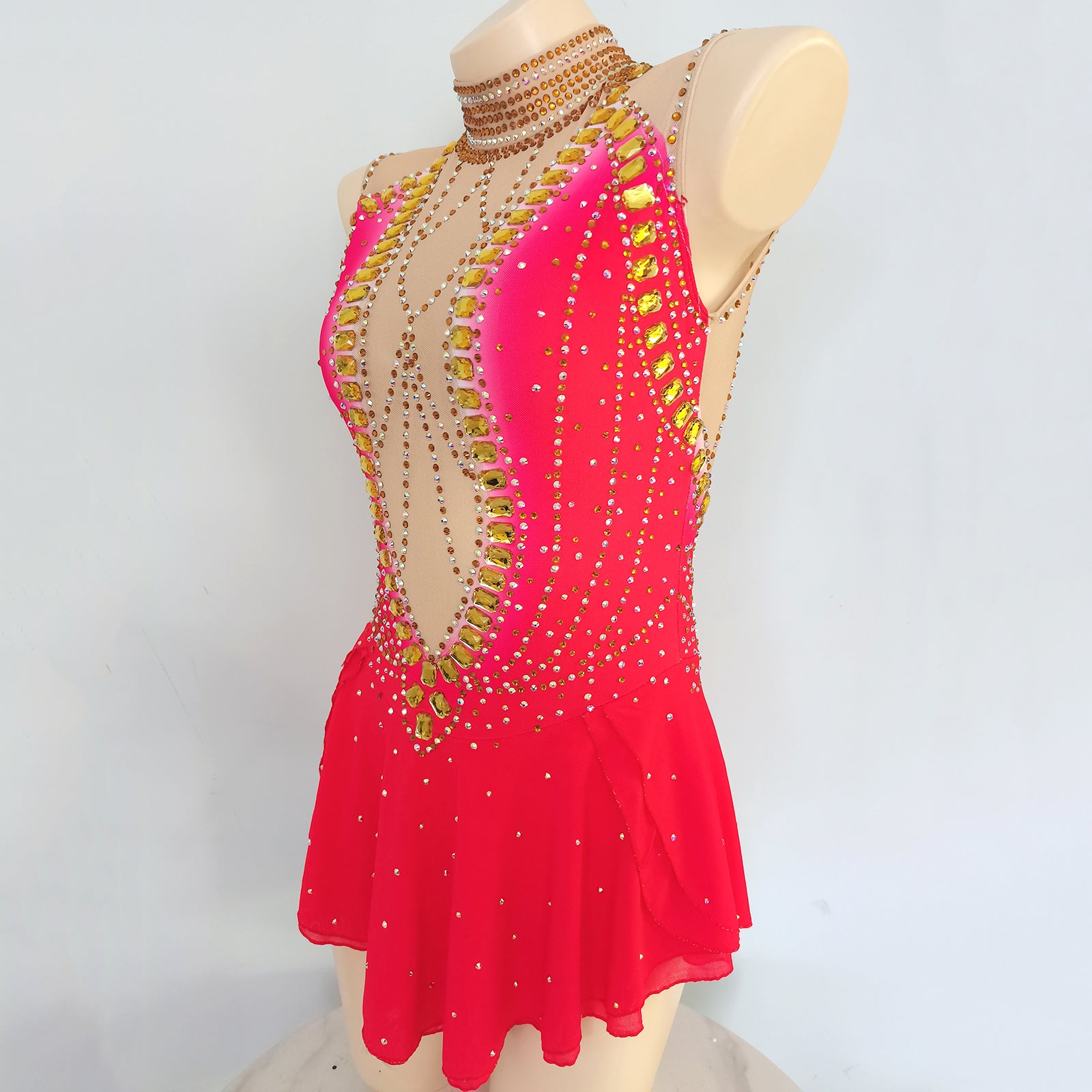 ❤ Features:This LIUHUO figure skating dress is a vibrant and eye - catching piece. Dominated by a striking red color, it exudes energy and passion. The upper part features a sheer panel that creates an elegant V - shaped neckline, surrounded by an array of dazzling golden embellishments. These golden details, combined with numerous sparkling rhinestones scattered across the dress, catch the light brilliantly, adding a luxurious touch. The sleeveless design and flared skirt enhance its dynamic look, making it perfect for skaters who want to make a bold statement on the ice.