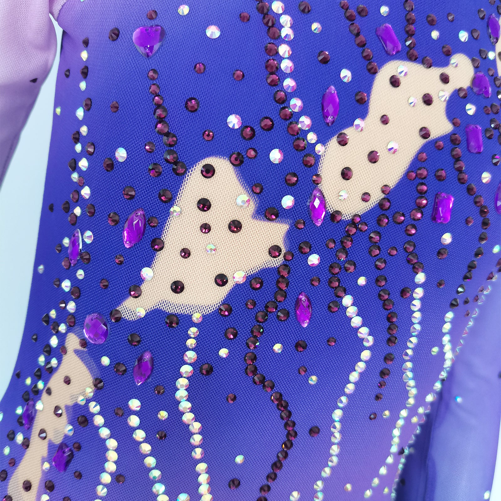 ❤ Features:This LIUHUO figure skating dress is a remarkable piece that exudes both style and grace. It showcases a stunning gradient from a soft lavender to a deep violet, creating a visually - appealing effect. The long - sleeved design features sheer sections that add a delicate touch. The dress is intricately embellished with an array of beads and sequins in various shades, meticulously arranged in wavy patterns that enhance its dynamic look. The scattered beige patches on the bodice provide an interesting contrast. Complemented by a flared skirt, this dress is perfect for skaters looking to make a statement on the ice.