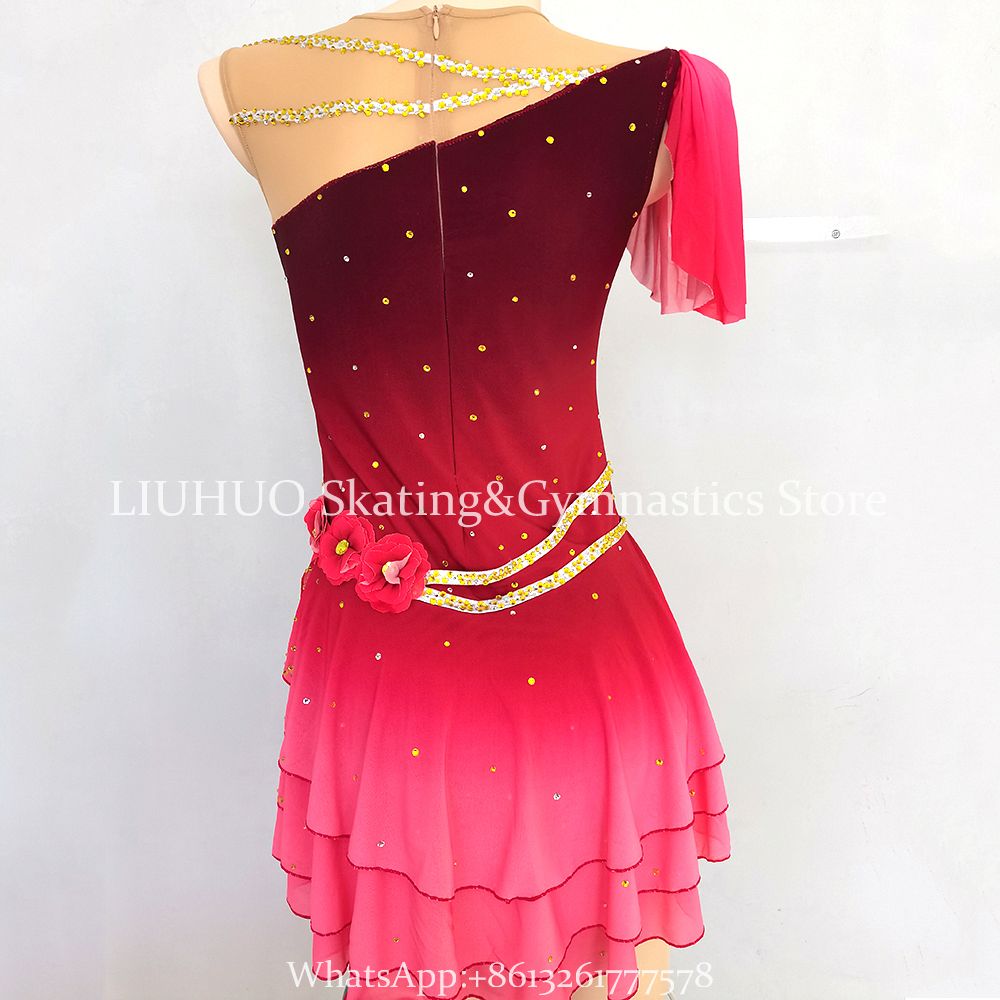 ❤ Features:This LIUHUO figure skating dress is a striking and glamorous creation. It features a vivid gradient from deep red to soft pink, giving it a dynamic and eye - catching appearance. The one - shoulder design, with a sheer beige panel, adds an elegant and alluring touch. The bodice is adorned with an abundance of glittering yellow embellishments that cascade down in wavy lines, creating a sense of movement. The ruched detailing on the bodice enhances the silhouette, while the waist is accentuated with a decorative band and a large, vibrant red flower. The flared, layered skirt allows for graceful movement on the ice, making it a perfect choice for skaters aiming to make a bold statement.