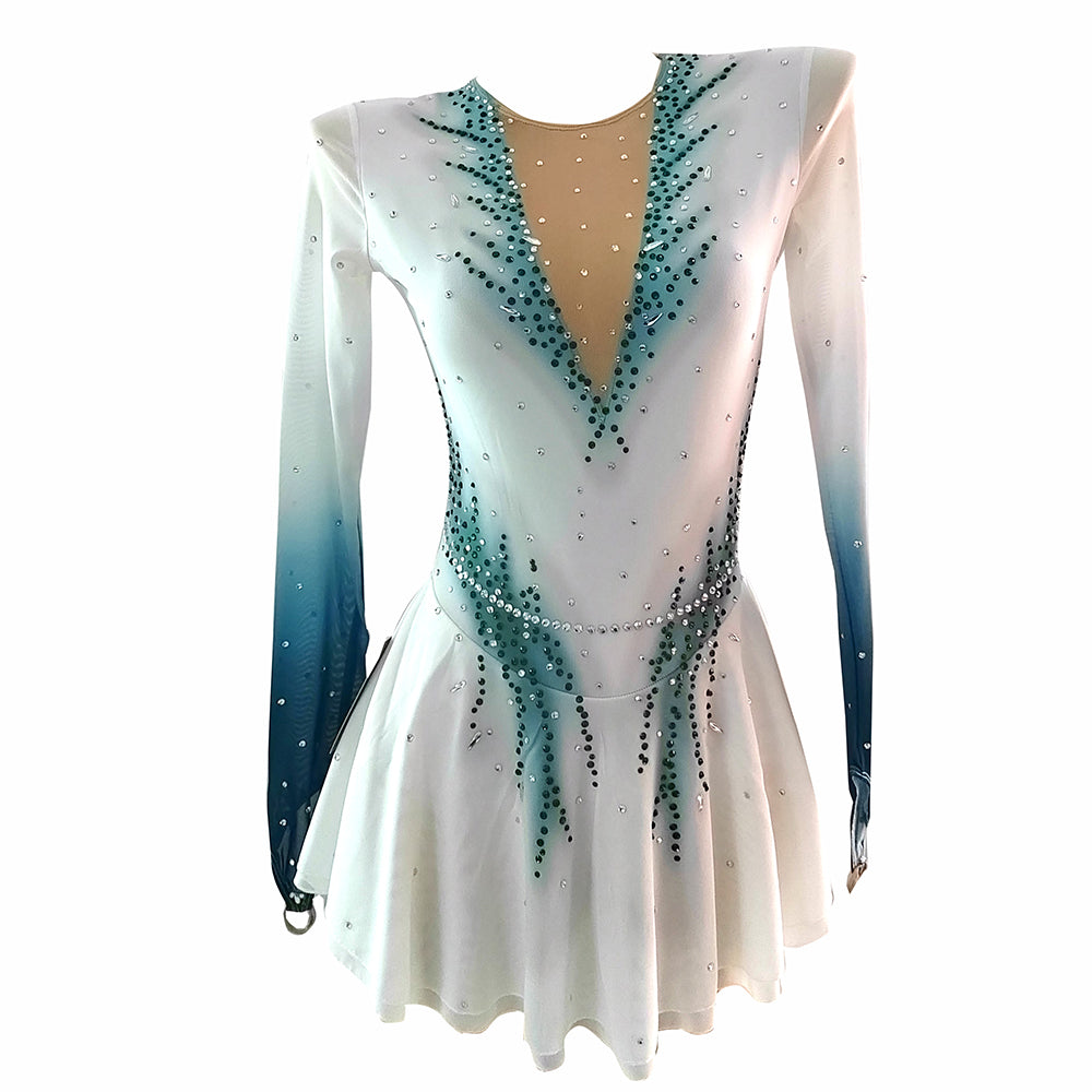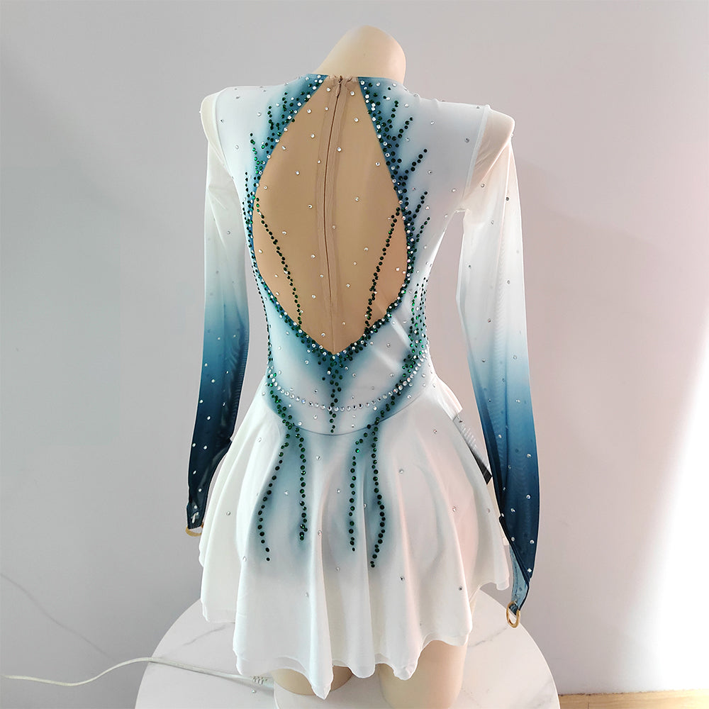 ❤ Features:This LIUHUO figure skating dress is a paragon of elegance and artistry. It features a soft gradient from white to a delicate teal, creating a serene and visually - appealing effect. The long - sleeved design with sheer sections at the shoulders and upper back adds a touch of allure. The bodice is adorned with an intricate arrangement of sparkling rhinestones in teal and silver, meticulously placed to form elegant patterns that cascade down the dress. The V - neckline, framed by the rhinestone embellishments, enhances the skater's silhouette. With its flowing skirt and refined details, this dress is perfect for skaters aiming to make a graceful statement on the ice.