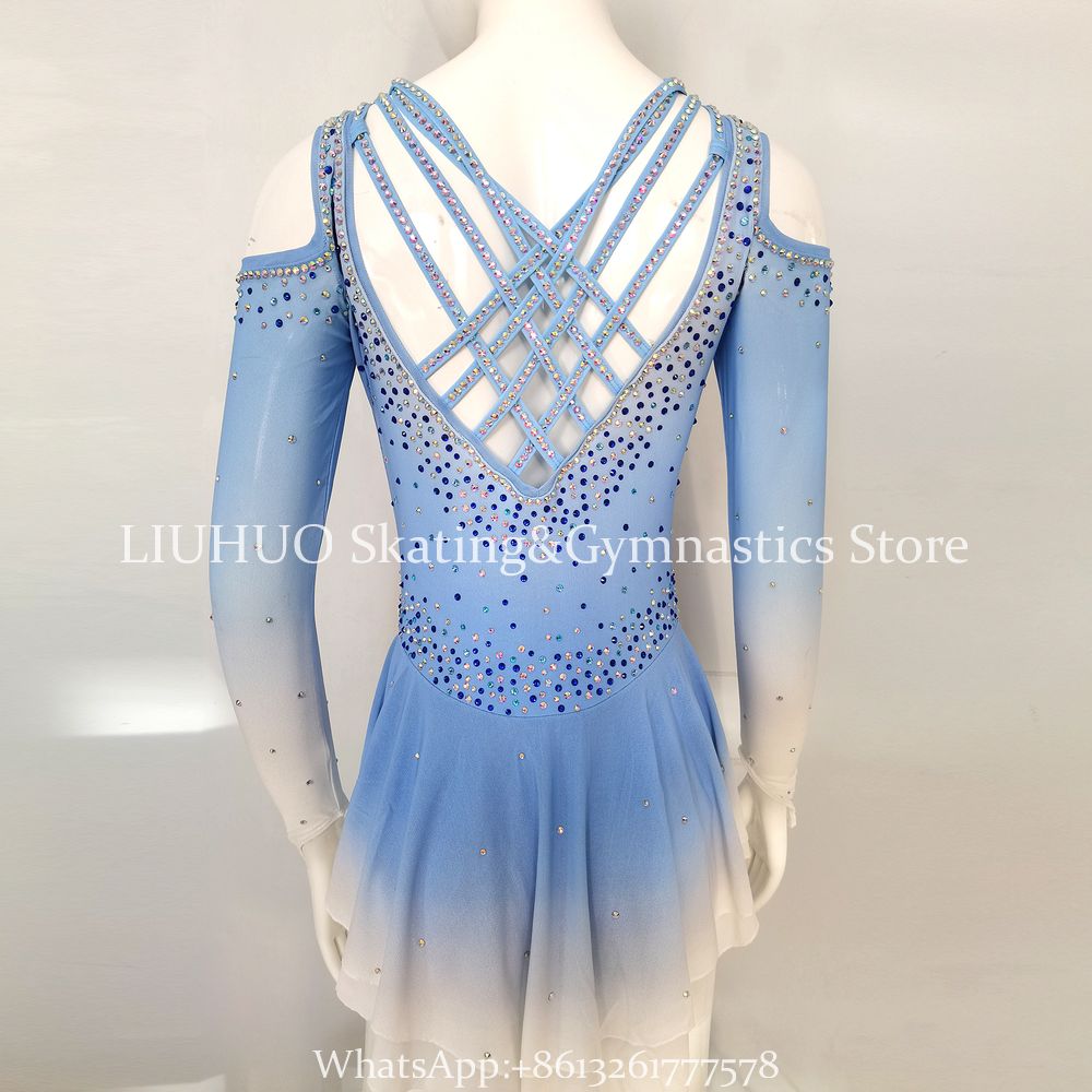❤ Features:This LIUHUO figure skating dress is a masterpiece of elegance and sparkle. It features a soft gradient from light blue to white, creating a dreamy and ethereal look. The long - sleeved design includes off - the - shoulder elements, adding a touch of allure. The front and back are adorned with numerous sparkling rhinestones, meticulously arranged to catch the light from every angle. The back showcases an intricate criss - cross strap design, further enhancing the dress's visual appeal and providing a secure fit. With its combination of delicate colors and dazzling embellishments, it's a perfect choice for skaters aiming to shine on the ice.