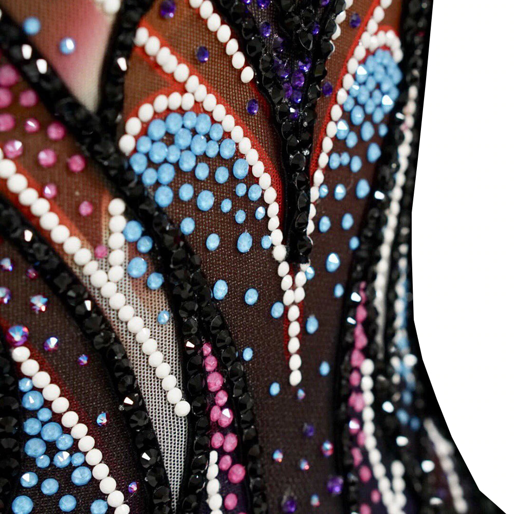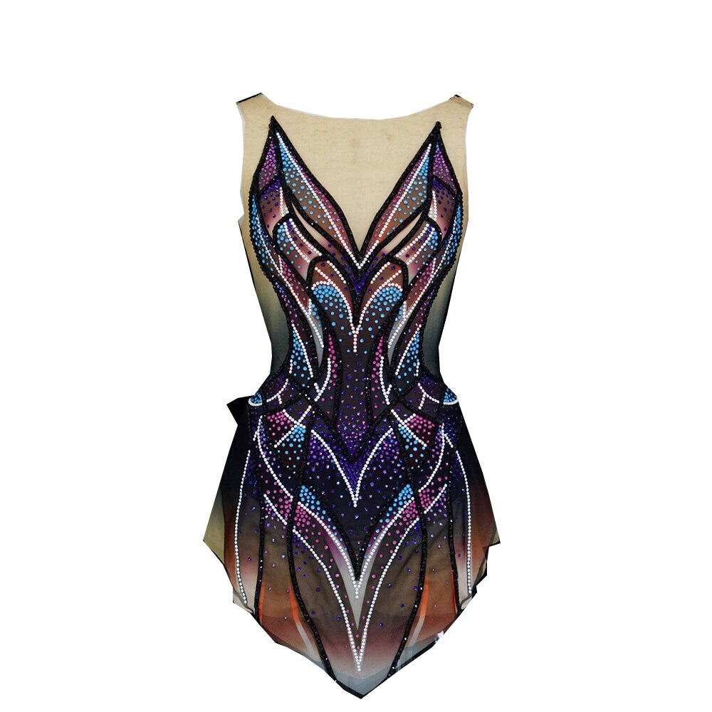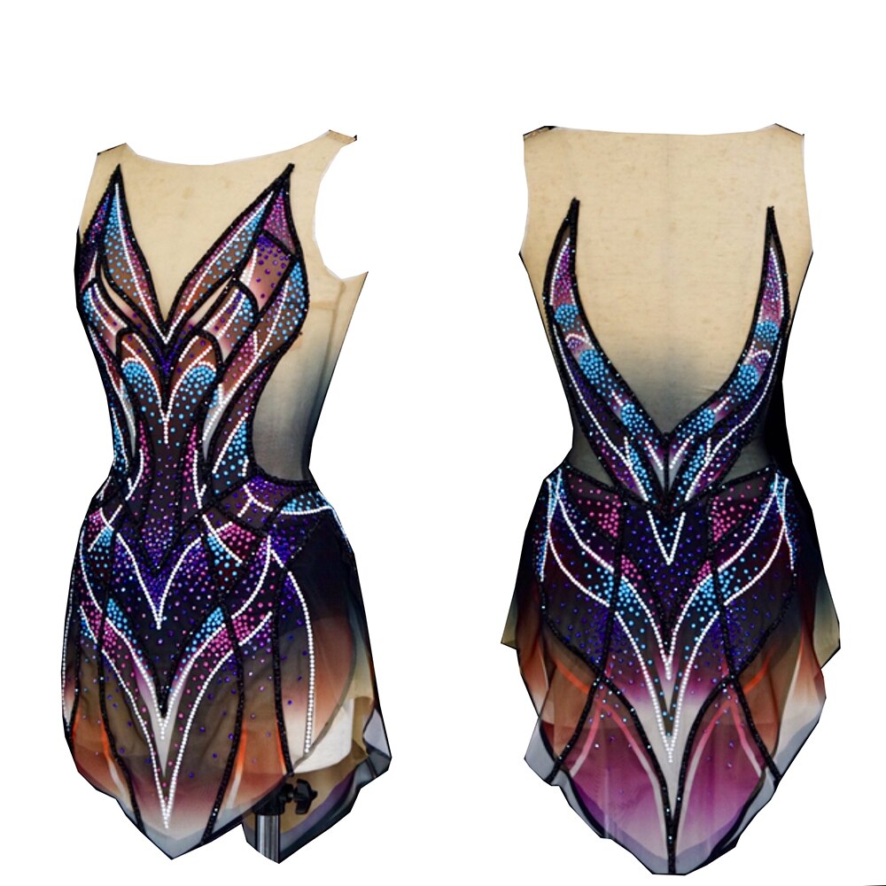 ❤ Features:This LIUHUO figure skating leotard is a stunning display of artistry and style. It features a sleeveless design with a deep V - neckline that draws the eye. The bodice is adorned with an intricate pattern of sparkling rhinestones in a spectrum of colors, including purple, blue, and pink, meticulously arranged to create geometric and abstract shapes. The gradient of dark to light hues, transitioning from black at the top to a warmer tone at the bottom, adds depth and dimension. The sheer panels on the sides enhance the overall allure, making it a perfect choice for skaters aiming to make a bold and fashionable statement on the ice.