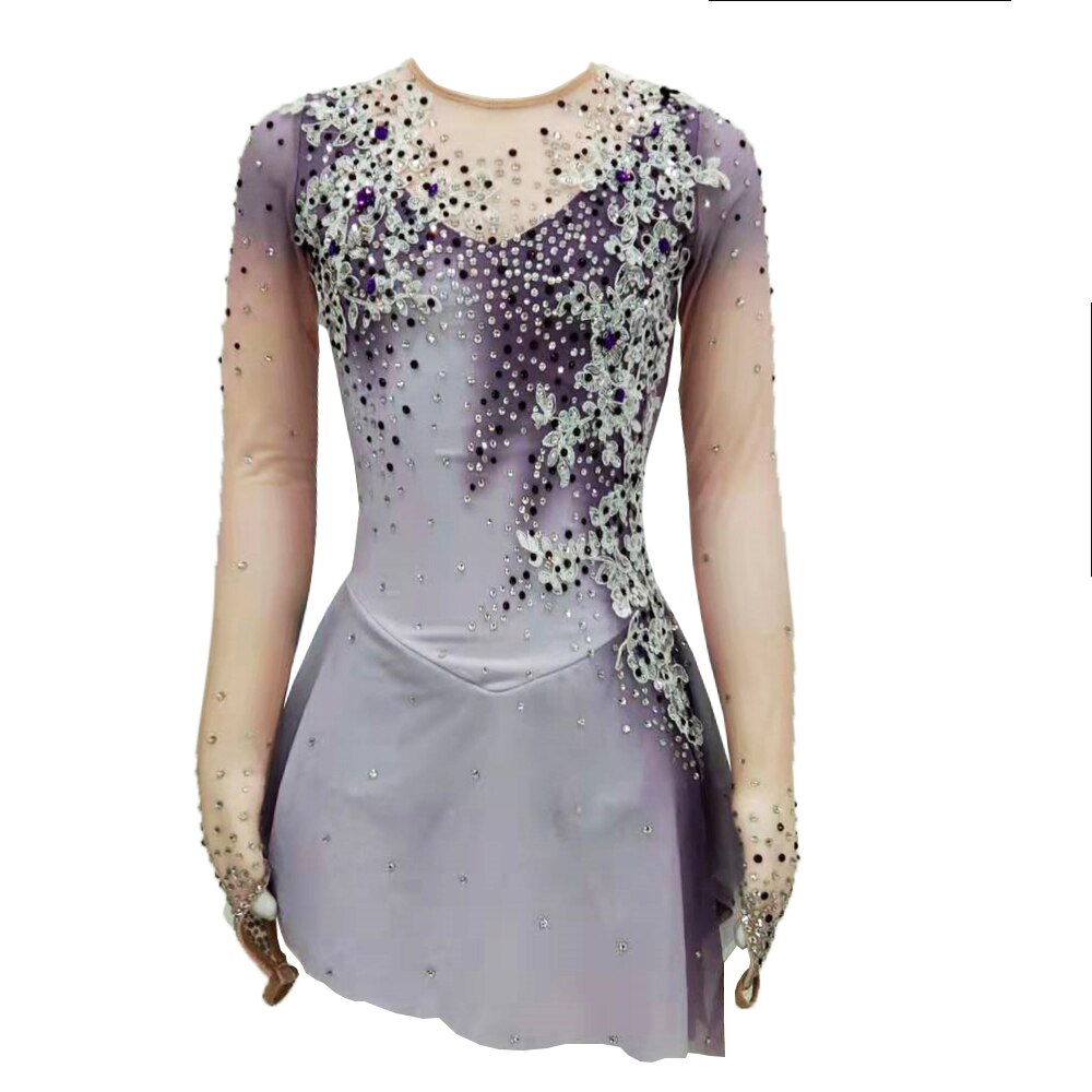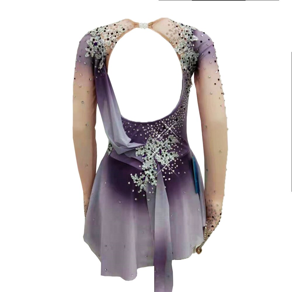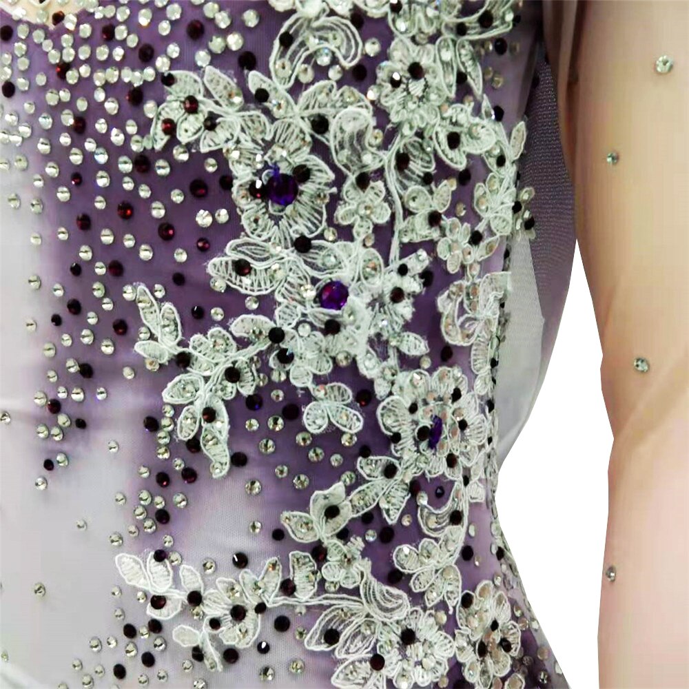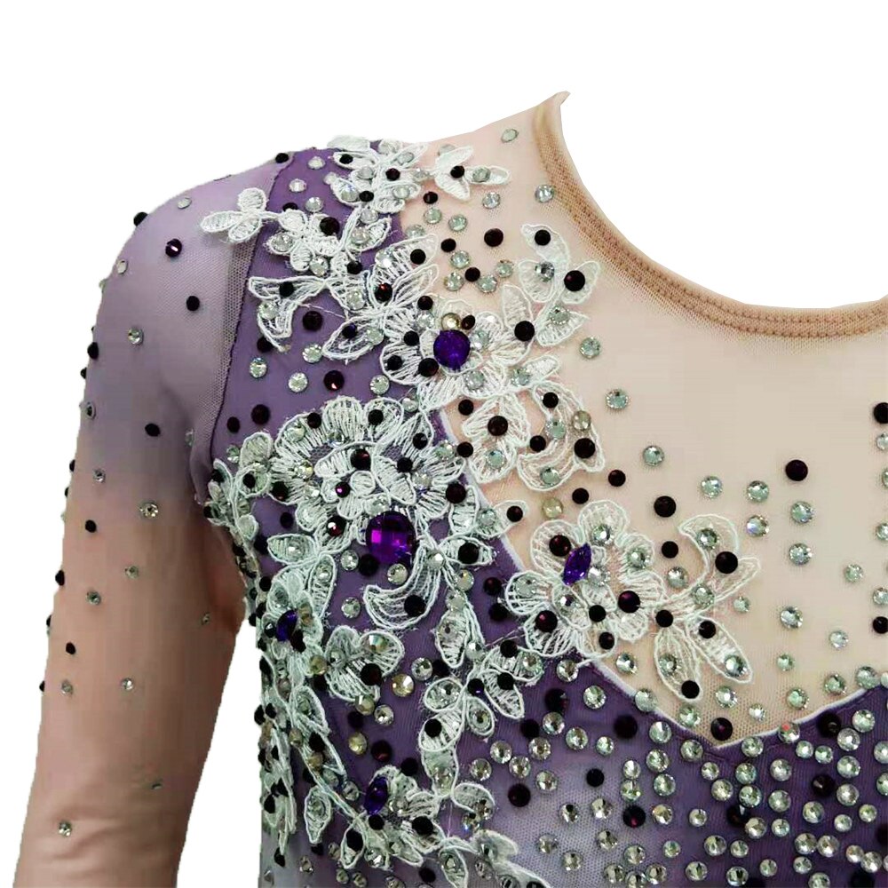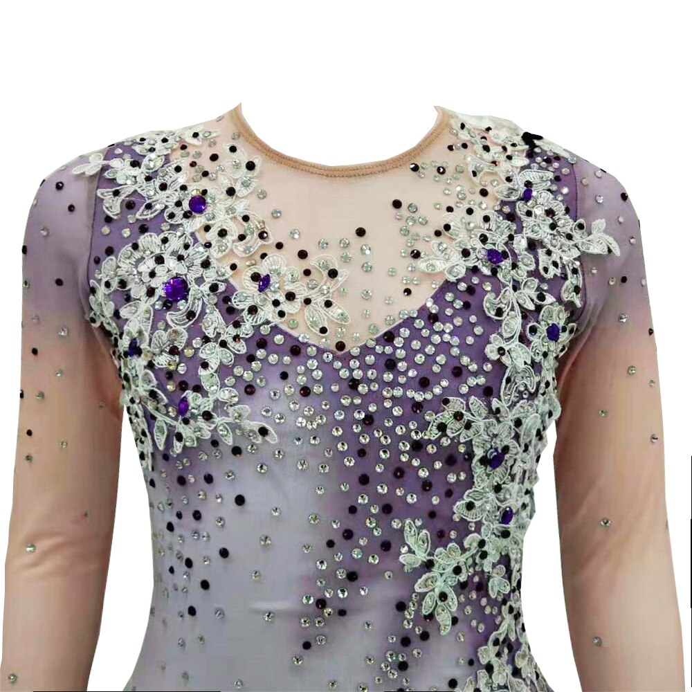 ❤ Features:This LIUHUO figure skating dress is a vision of elegance. It features a soft lavender base color with a gentle gradient effect. The V - neckline and long, sheer sleeves are exquisitely adorned with an array of sparkling rhinestones and delicate floral - shaped embellishments in silver and purple, creating a captivating contrast. The fitted bodice accentuates the figure, flowing into a gracefully flared skirt. Every detail of this dress is designed to make skaters shine on the ice, combining beauty and functionality seamlessly.