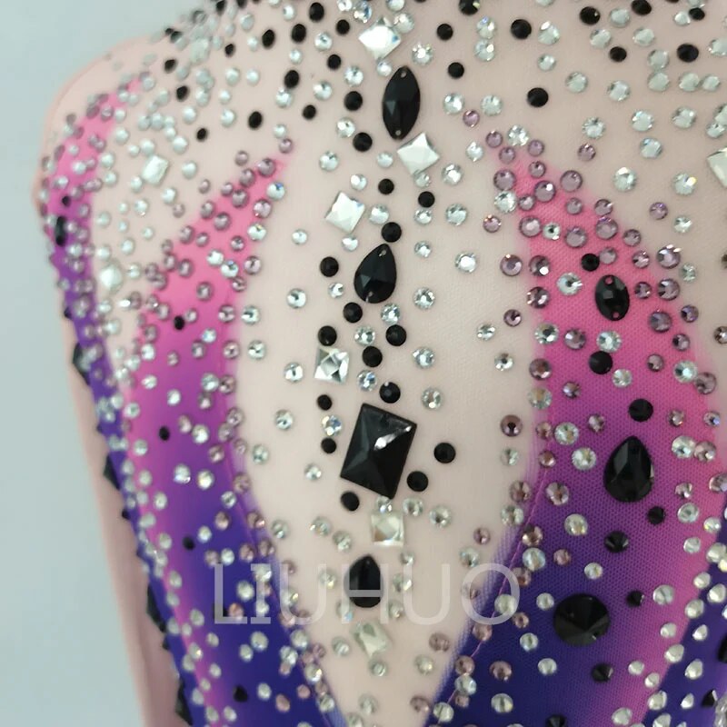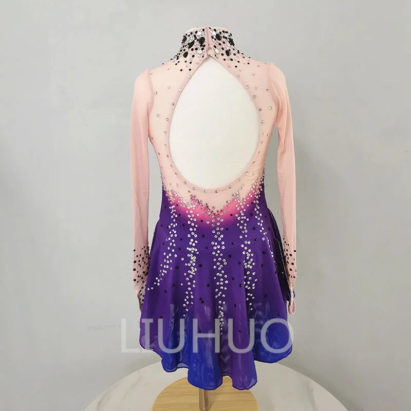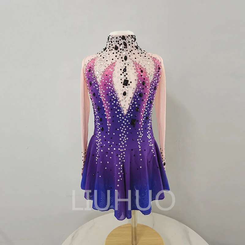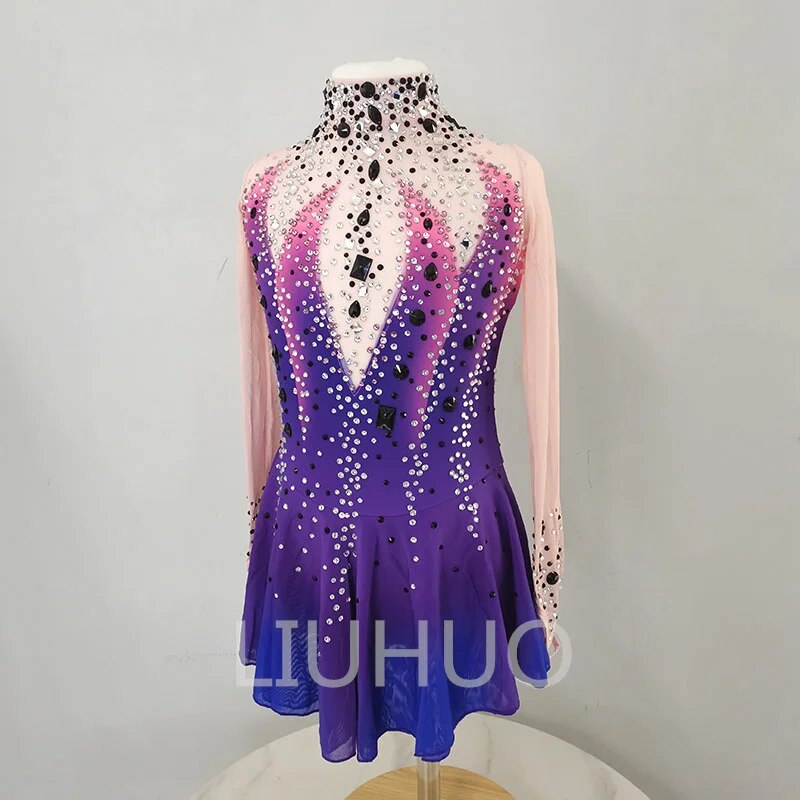 ❤ Features:This LIUHUO figure - skating dress is a striking piece. It features a high - neck design with a sheer mesh back, creating an alluring and elegant look. The dress showcases a gradient of purple hues, transitioning from a lighter shade at the top to a deeper purple at the bottom. The bodice and sleeves are lavishly adorned with an array of rhinestones in various shapes and sizes, predominantly in black and clear, arranged in dynamic patterns that catch the light. The flared skirt adds a sense of movement, making it both stylish and suitable for figure - skating performances.
