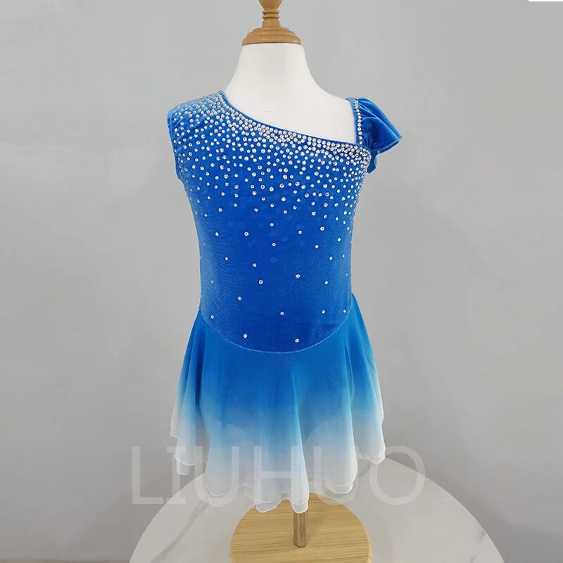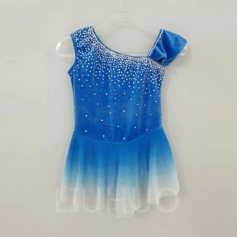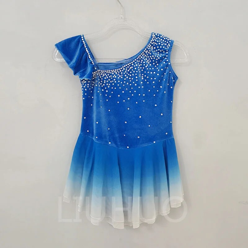 ❤ Features:This LIUHUO figure - skating dress showcases a striking one - shoulder design. The bodice is adorned with numerous sparkling rhinestones, creating a dazzling effect. The dress features a gradient of blue hues, transitioning smoothly from a deeper blue at the top to a lighter shade towards the bottom of the skirt. The flared skirt adds a sense of movement and grace, making it an ideal choice for figure - skating performances, combining both style and functionality.
