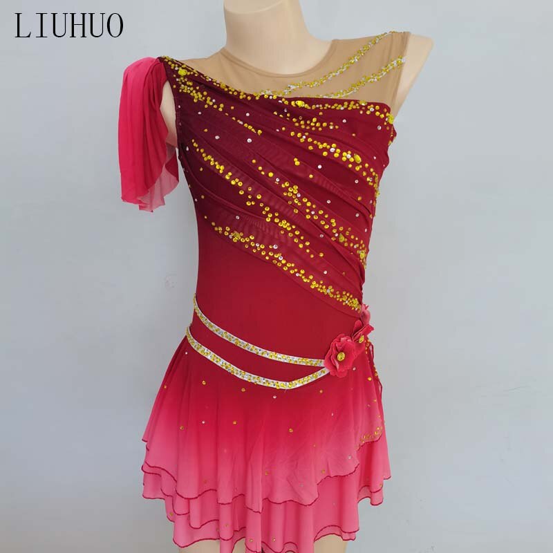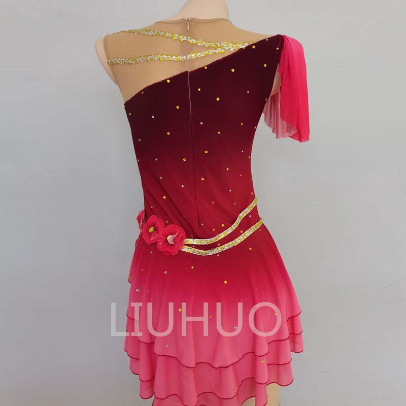 ❤ Features:This LIUHUO figure - skating dress is a stunning piece. It features a gradient color scheme transitioning from deep red at the top to soft pink at the bottom. The one - shoulder design showcases a flowing pink fabric that adds an elegant touch. The bodice is embellished with numerous sparkling golden rhinestones arranged in diagonal patterns, creating a dazzling effect. A decorative belt with a floral embellishment cinches the waist, enhancing the silhouette. The ruffled skirt allows for graceful movement, making it perfect for performances on the ice.