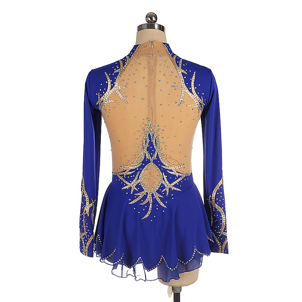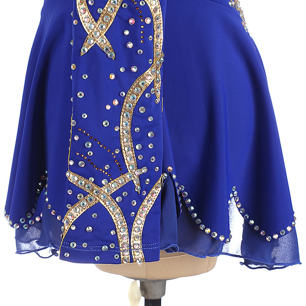 ❤ Features:This LIUHUO figure skating dress is royal blue, with long sleeves. It features elaborate gold - toned, rhinestone - encrusted patterns on the bodice and sleeves. The skirt has a flared shape with a sheer, ruffled trim adorned with crystals, creating an elegant look for skating performances.