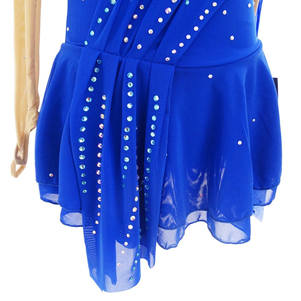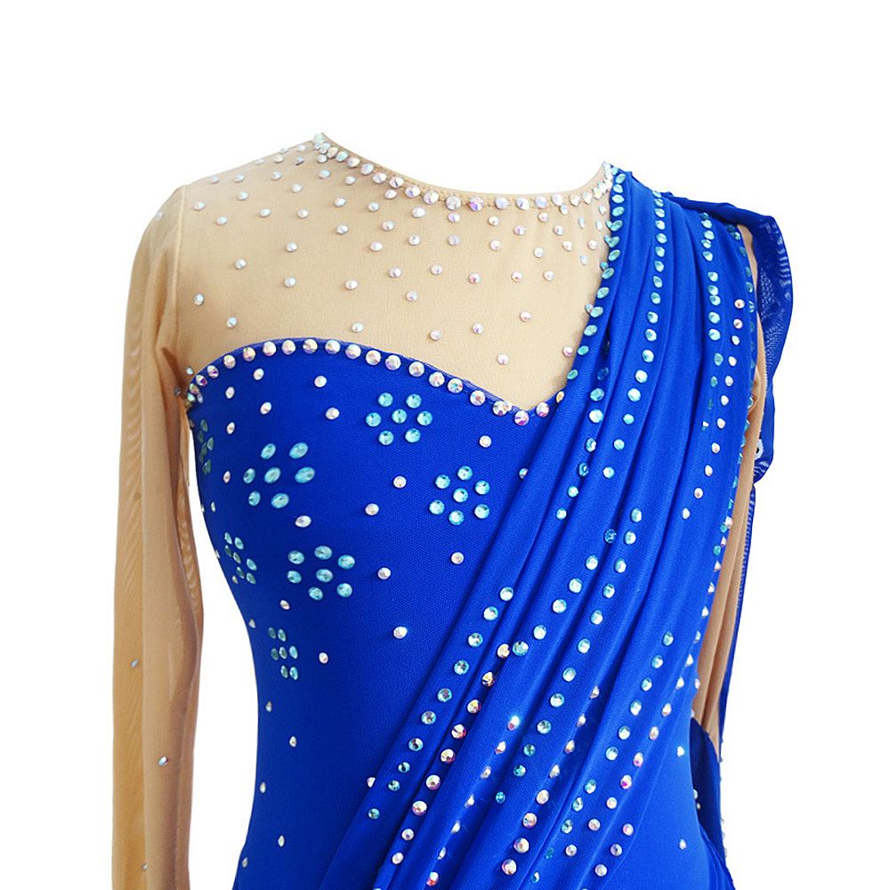 ❤ Features:This LIUHUO figure skating dress is royal blue, featuring sheer beige sleeves and a sheer neckline adorned with rhinestones. It has an asymmetric drape design on the bodice, decorated with scattered sparkling stones. Made of high - elastic fabric, it’s tailored for girls and women, ideal for skating competitions.
