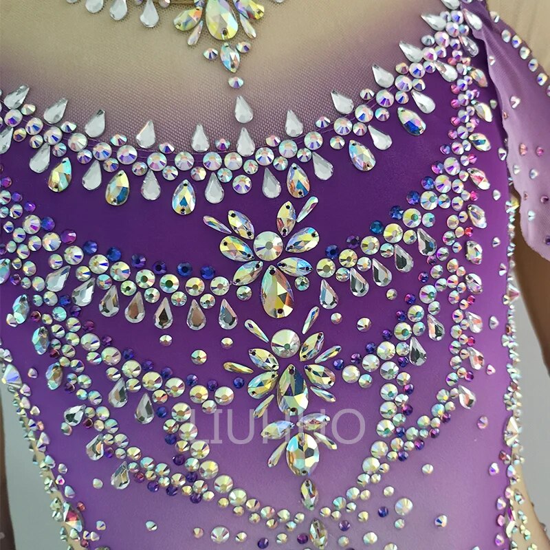 ❤ Features:This is a figure - skating dress from the brand LIUHUO. The overall color is mainly purple, with a gradient effect. The sleeves transition from skin - tone to black, designed with short flared sleeves over long sleeves. The neckline and the skirt are embellished with delicate and sparkling rhinestones, giving it a luxurious look. There is also an ornate necklace - style decoration at the neckline. The skirt has a multi - layer ruffled design, which is light and graceful, making it suitable for showcasing elegant postures during figure - skating. It can also be used as training attire for dance art exams and other occasions.