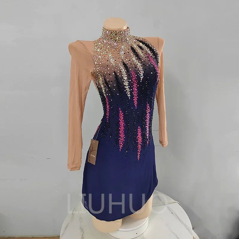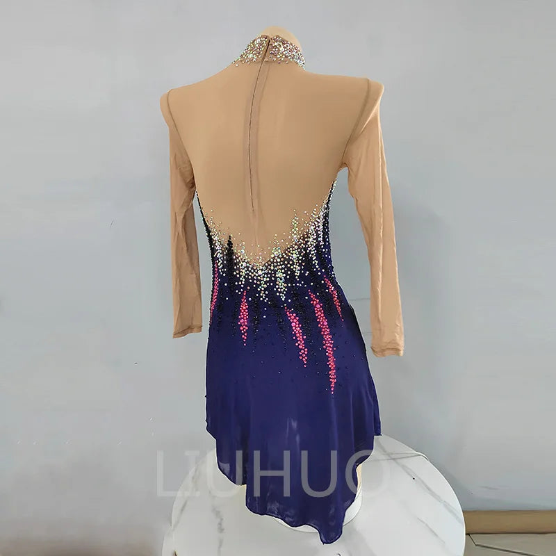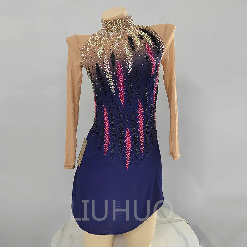 ❤ Features:This LIUHUO figure - skating dress is a remarkable piece. It features a high - neck design with sheer mesh sleeves, creating an elegant and somewhat mysterious look. The dress showcases a deep blue base color, adorned with an abundance of rhinestones. The rhinestones are arranged in striking vertical patterns, with alternating black and pink sections that add a dynamic and vibrant contrast. The upper part of the dress, including the neckline, is densely embellished with sparkling rhinestones, catching the light beautifully. This dress combines glamour and sophistication, making it a great choice for figure - skating performances.