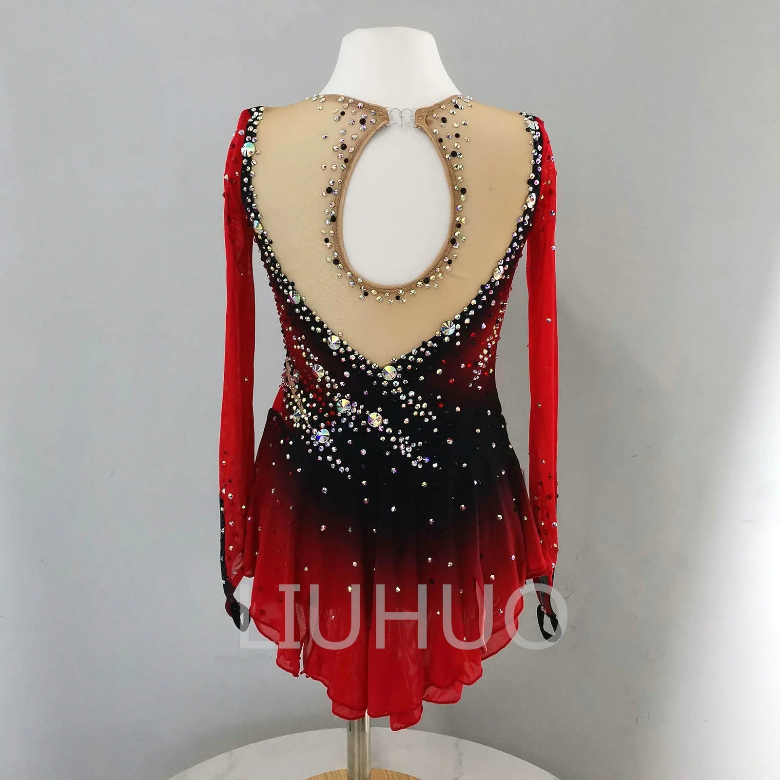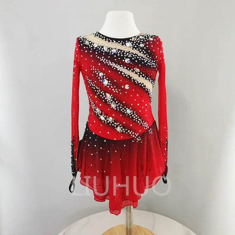 ❤ Features:This LIUHUO figure - skating dress is a vibrant and eye - catching piece. In a striking red color with a gradient effect transitioning to black, it features long sleeves. The bodice is adorned with an array of sparkling rhinestones in various shapes and sizes, meticulously arranged in diagonal stripes that create a dynamic visual impact. The sheer mesh sections add an elegant and delicate touch. The flared skirt allows for graceful movement, making it both stylish and practical for figure - skating performances. This dress combines bold color with intricate detailing to ensure the skater stands out on the ice.